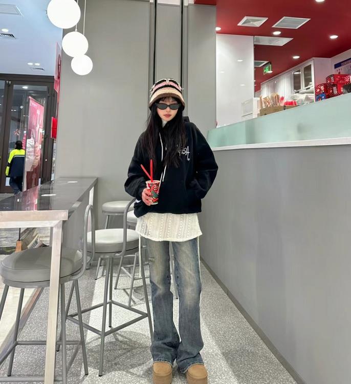 過年不知道穿什麼的話,就給自己準備一件衛衣吧,黑色連帽衛衣疊穿白色打底,露出一截的內搭來,輕鬆打造出層次感。牛仔拖地長褲+厚底雪地靴,輕鬆營造出隨意氛圍感。