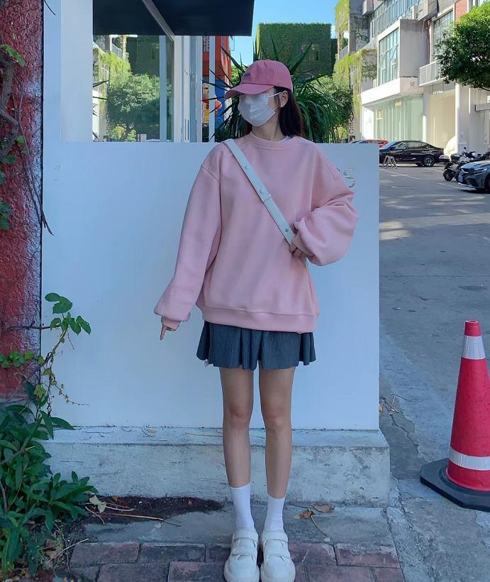 春天穿粉色真的少女感爆棚啊,好好看的一身穿搭,寬鬆套頭衛衣+灰色百褶裙,青春又減齡。白色鞋子+白色襪子,將襪子外露出來,就很好打造出層次感了。