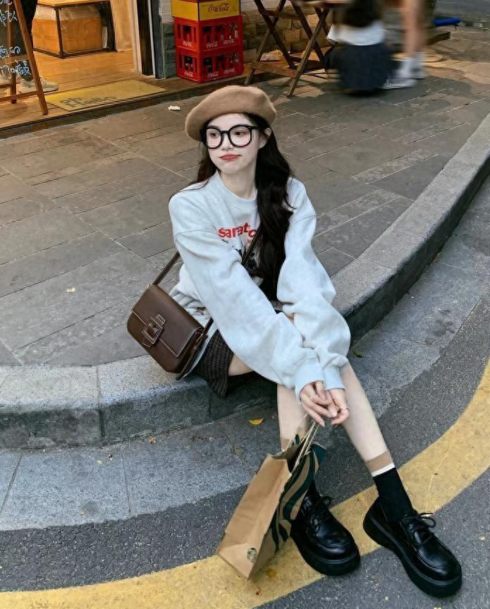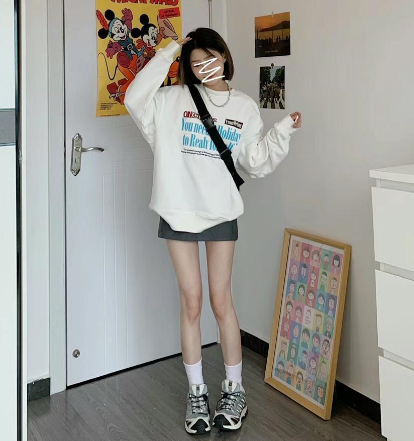 南方的女孩,在過年溫度回升後可以這麼穿,乾淨的白色衛衣,版型是寬寬大大的,超級喜歡。搭配半身短裙+運動鞋,一整個青春減齡的味道。