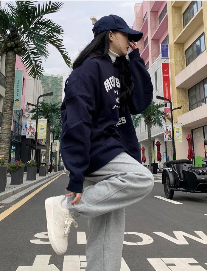 想要打造學院風,又怎能少了一件衛衣呢?藏藍色連帽衛衣,裏面疊穿白色高領打底,微露出裏面的打底,整個穿搭就多了幾分層次感。選擇灰色束腳運動褲來配,更添休閒感。