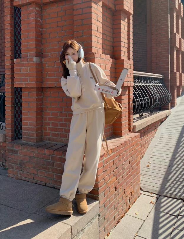 這一身衛衣套裝,真的很省心,完全不用擔心會出錯,不管是戶外運動,還是逛街都很合適。至於鞋子的搭配,選運動鞋、帆布鞋或者是雪地靴都行。