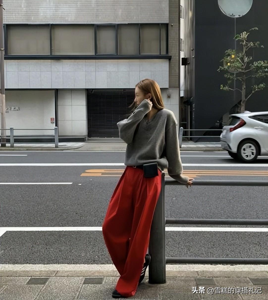 灰色是很文藝,也是今秋當之無愧最火的一個基礎色,灰色能夠中和紅色的炸眼,讓紅色低調一些,更符合當下鬆弛感穿搭的需求,並且不會破壞紅色的成熟氣質。