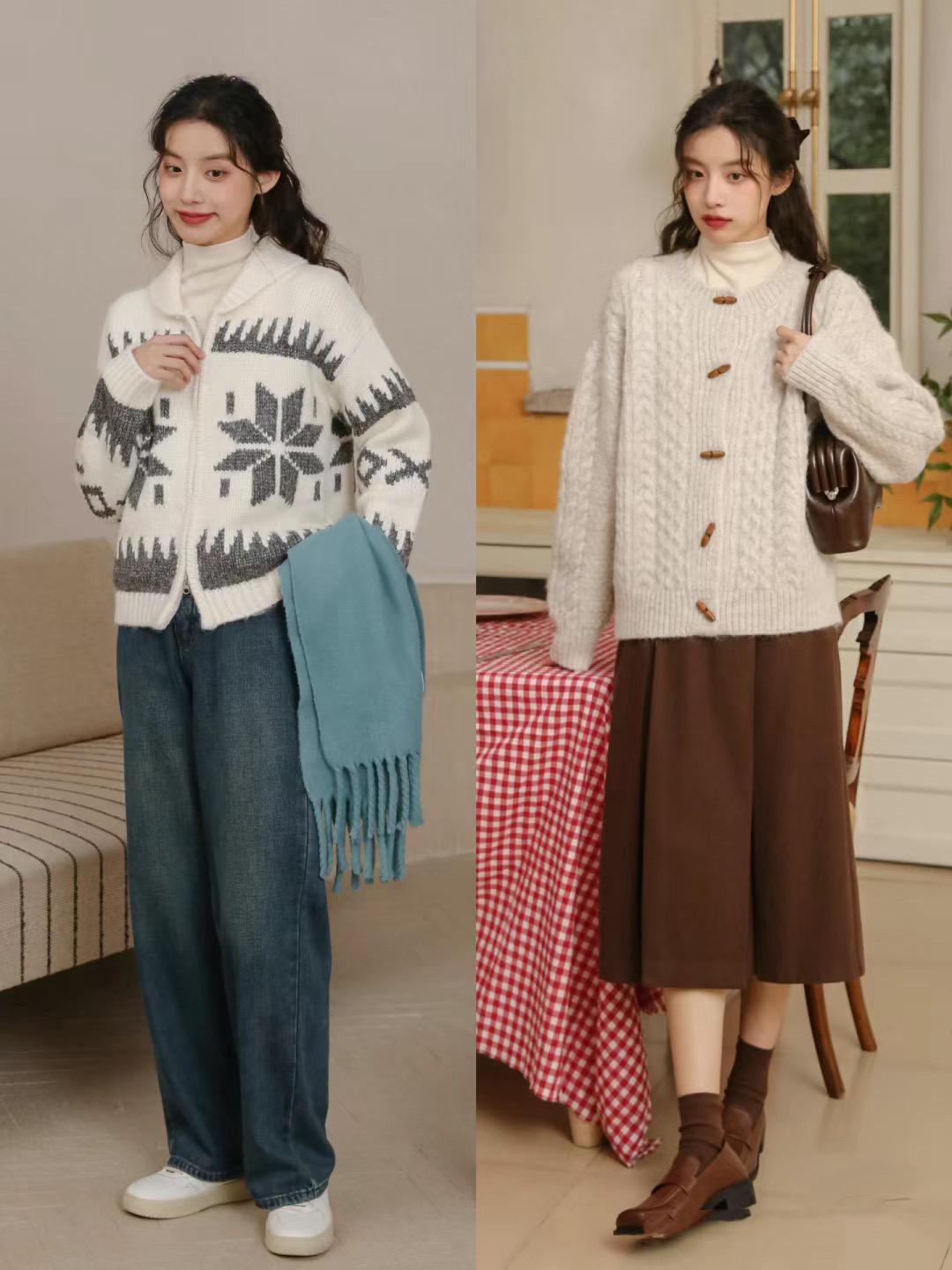 不得不說奶奶開衫也是一種比較大方又顯氣質的單品,像這種印花元素的奶奶開衫、或者絞花元素的奶奶開衫,穿起來都帶有復古情懷,更加的大方顯氣質。