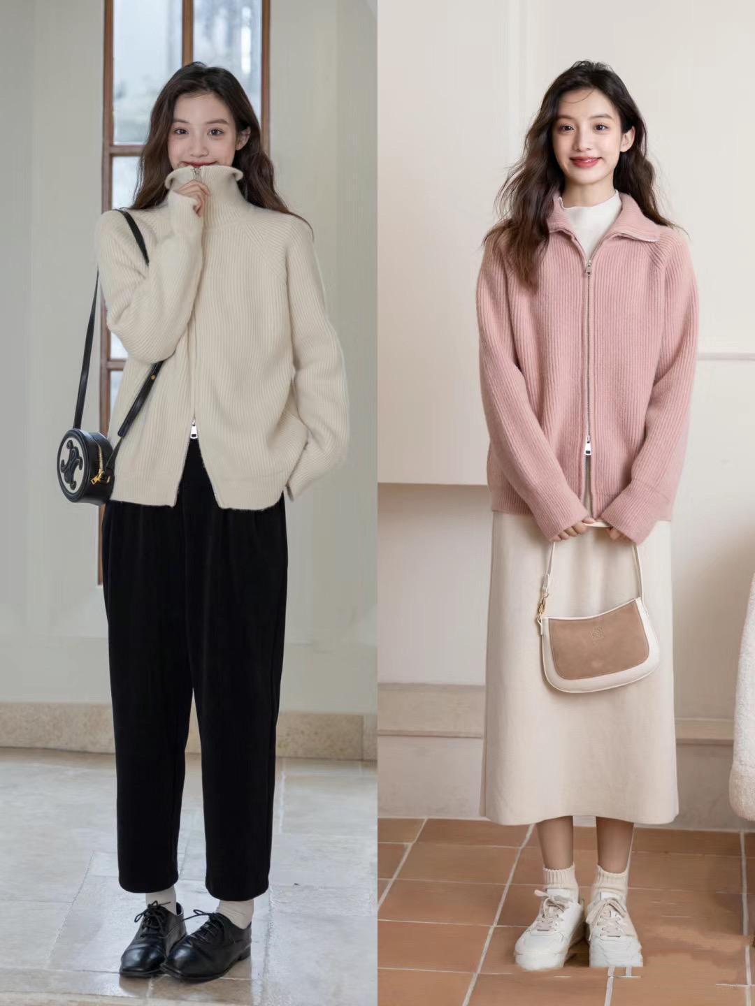 用針織開衫來搭配半高領的打底衫,擁有一種更加清晰的層次感。尤其是半高領的打底衫來搭配稍微寬鬆的針織衫,舒適自然、氛圍感也更強。