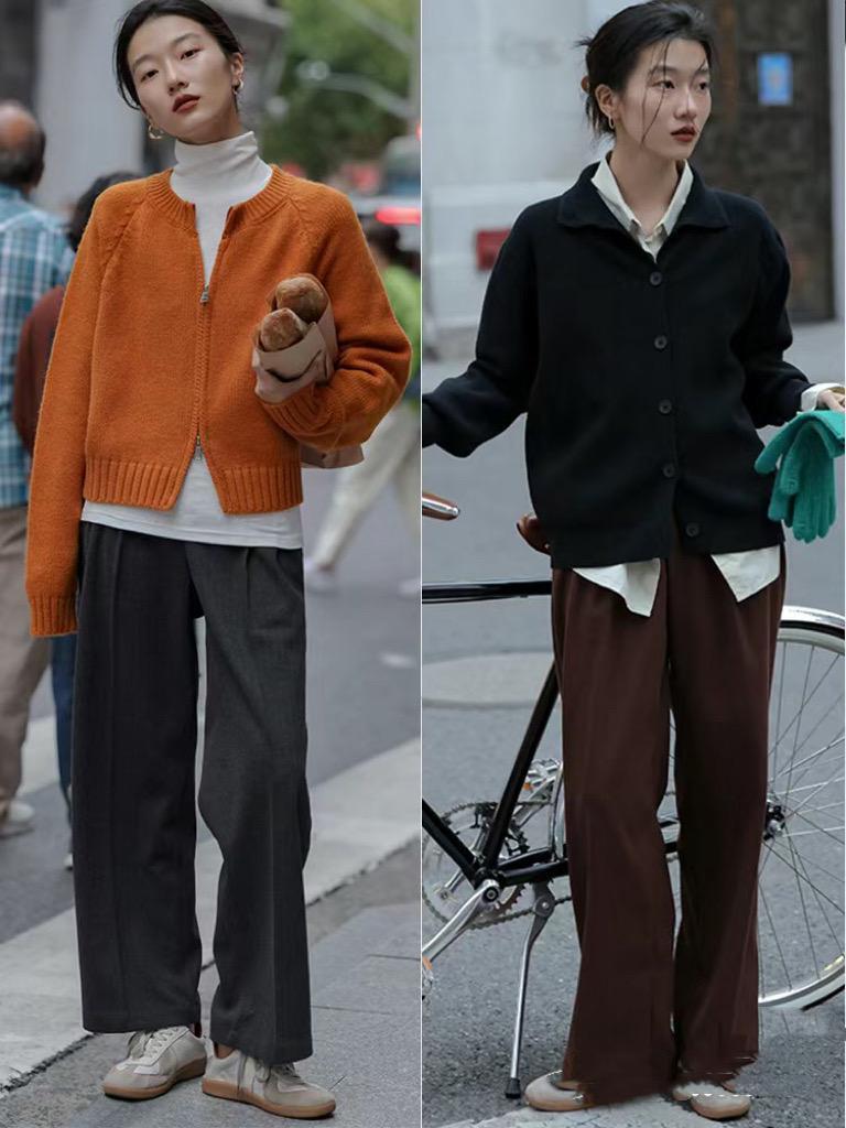 寬鬆的針織開衫,可以直接搭配高腰的毛呢褲。毛呢褲垂墜的面料,拉伸了雙腿的比例。毛呢褲厚實垂墜,視覺延伸性更強,想要大長腿都可以選擇這組搭配。