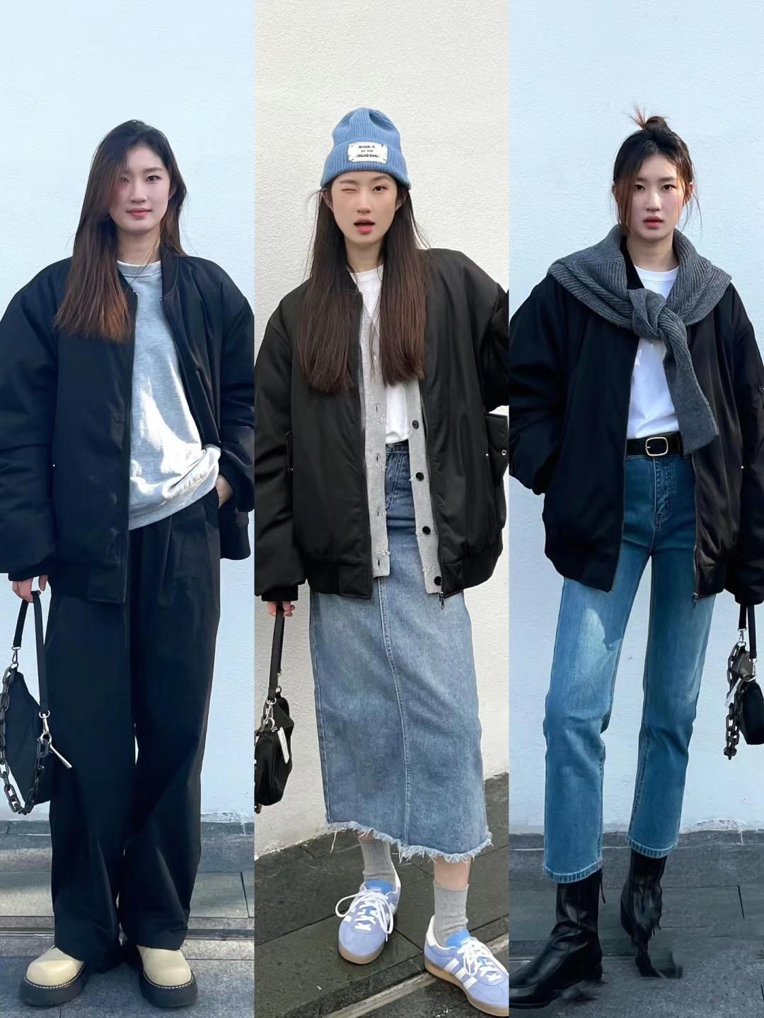 我們搭配休閒風的黑色夾棉外套,儘量搭配比較利落清爽的內搭。比如基礎款的白色T恤、或者淺色系的針織衫,穿起來都更加溫柔。配寬鬆的黑色夾克,舒適度也更強。