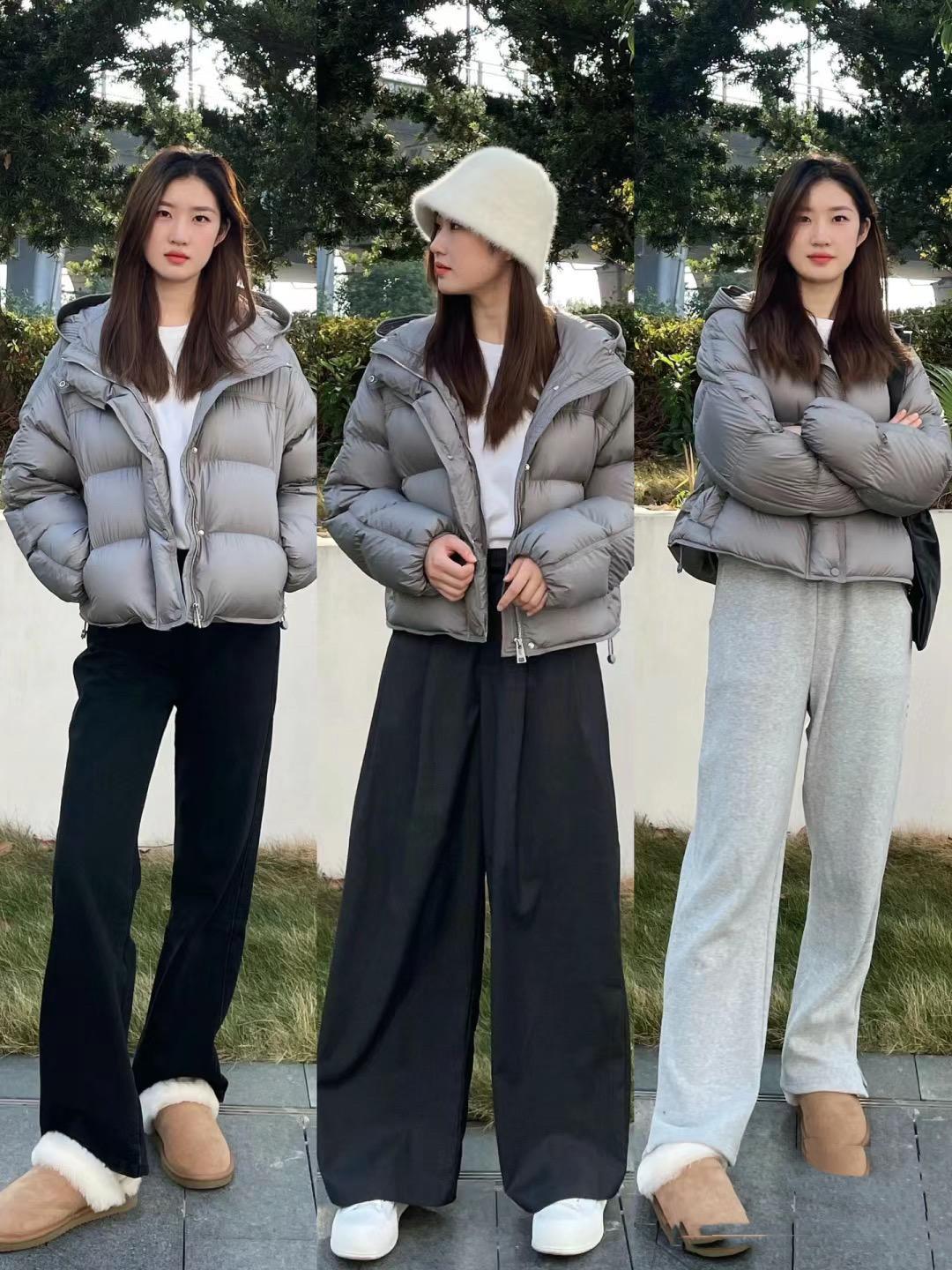 短款的羽絨服,我們可以搭配高腰的直筒褲來穿着。上短下長的穿衣方式,會顯得雙腿更加修長。高腰直筒褲可以選擇稍微修身的款式、也可以搭配闊腿褲的款式,主要是看自己的身形和喜好。