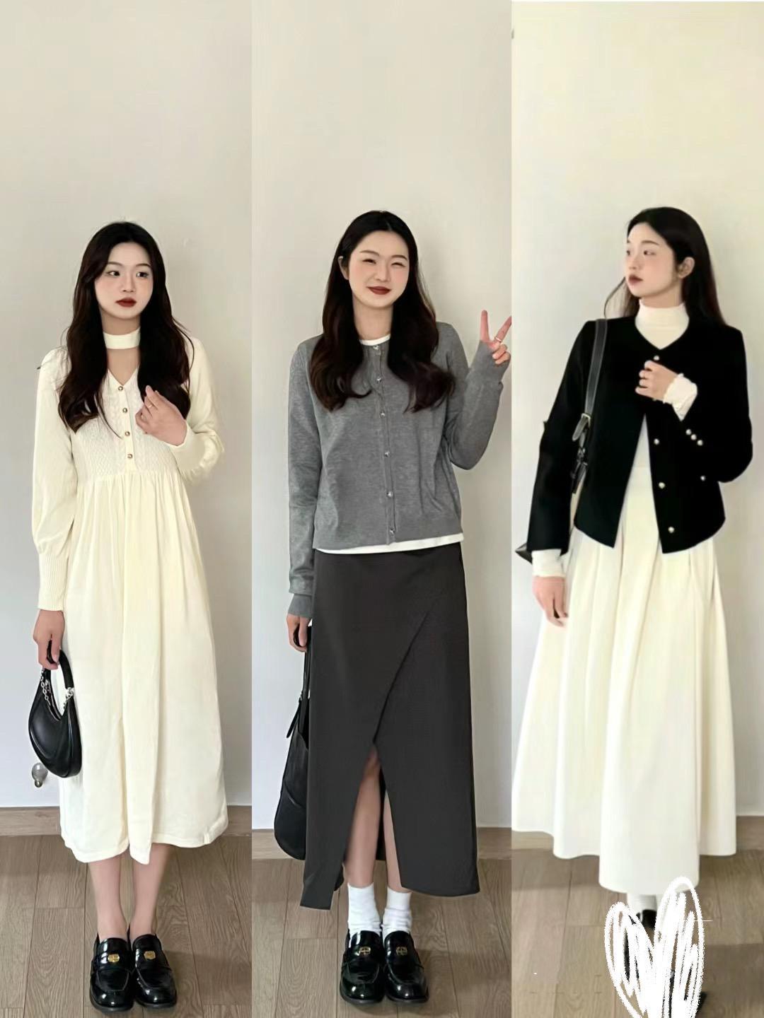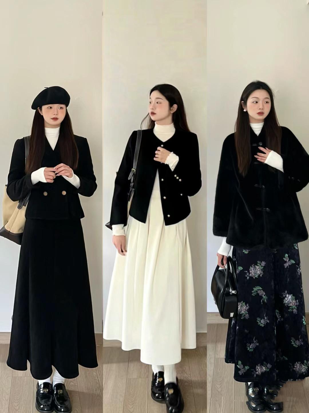 在白色連衣裙的基礎上,疊搭半高領的打底衫,就充滿了冬日氛圍,保暖性和舒適度同樣在線。外出的話,只需要搭配一件利落的小香風外套,就綻放出精緻美。