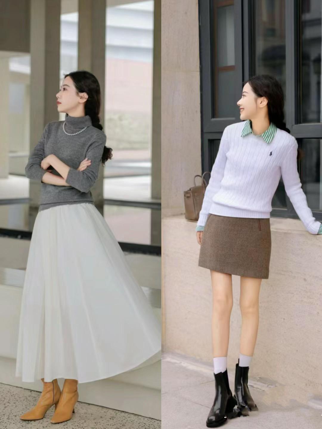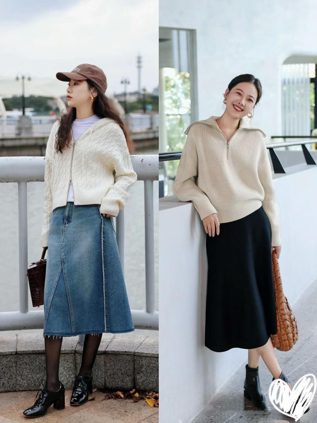 這種相對厚實的燕麥色毛衣或者米白色毛衣,可以配比較利落、垂順的半身裙。比如經典的牛仔半身裙、或者高級感十足的黑色半身裙,都可以表現出優雅大氣的美。