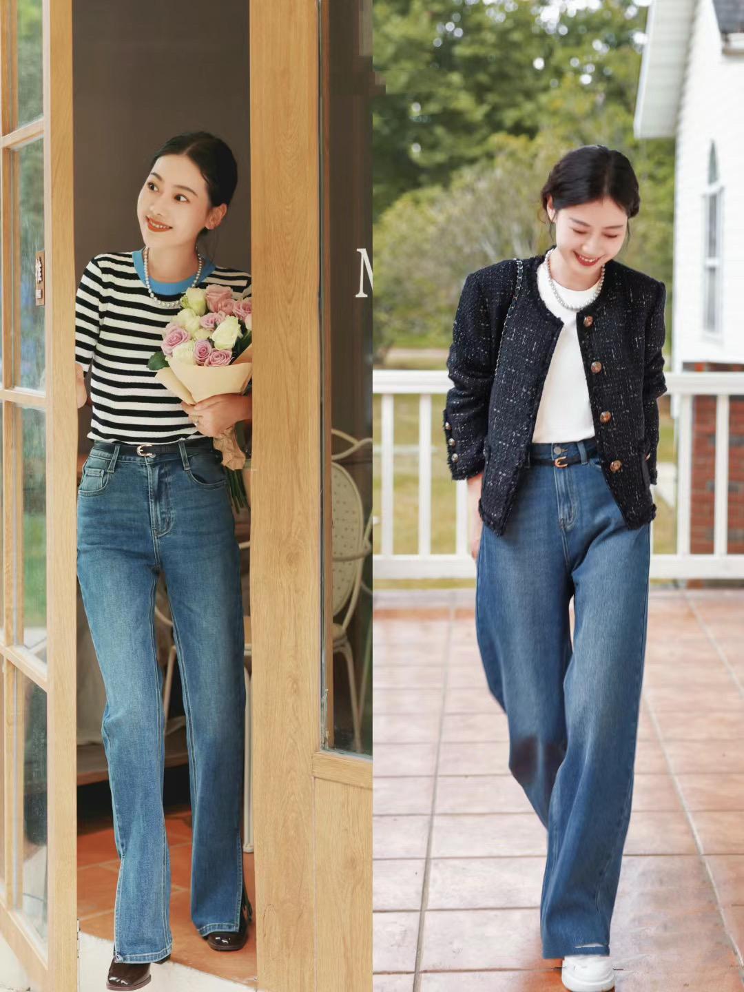 我們選擇牛仔闊腿褲的時候,儘量搭配面料垂順的款式。高腰的牛仔闊腿褲,可以配精緻的小皮鞋、也可以搭配厚底的小白鞋、清新自然的穿衣風格也是格外的減齡。