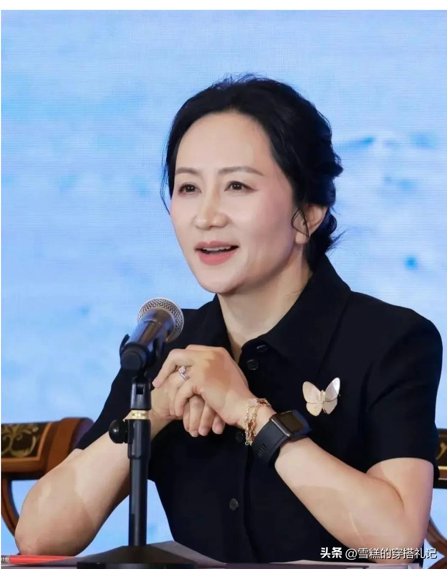 孟晚舟在日常生活當中更喜歡用精緻的胸針來提升造型感,比如在穿黑色系的西裝外套或者職場套裝的時候,她往往會別一枚造型簡約+顏色亮麗的胸針進行點綴,使得整個造型都更加的時尚洋氣。