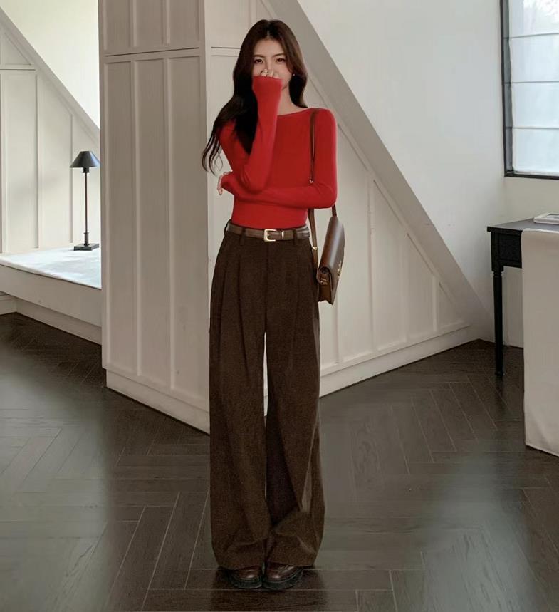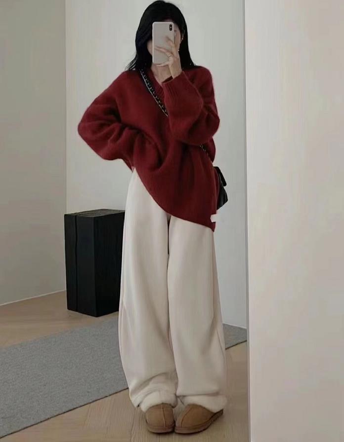 暗紅色大毛衣,寬鬆的版型,實在是太喜歡了,與奶白色闊腿拖地褲組合,隨性休閒又顯瘦。鬆弛感十足的一套。