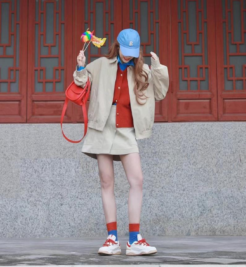 這兩種配色高級又驚豔,紅色的襪子很好與上衣進行呼應。