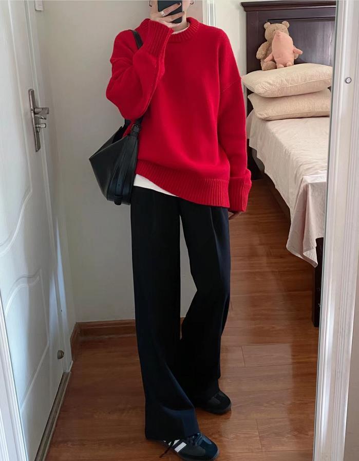紅色毛衣+黑色西裝褲,一下子就將新年的氛圍感拉滿了,簡約卻帶着幾分慵懶的味道。毛衣裏面疊穿一件白色t恤,能豐富整個着裝造型時髦度。