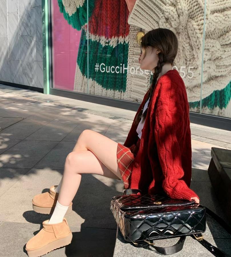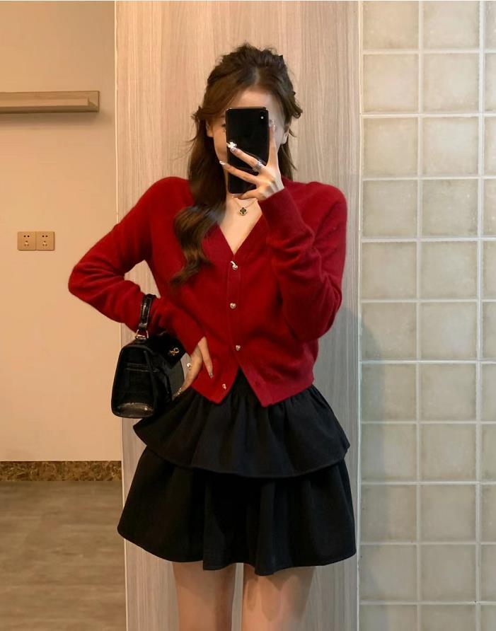 紅黑配色的穿搭,很耐看時髦呢,由內到外都透着高級,軟軟糯糯的紅色毛衣開衫,小短款的長度,最適合個矮的姐妹了。