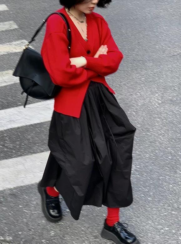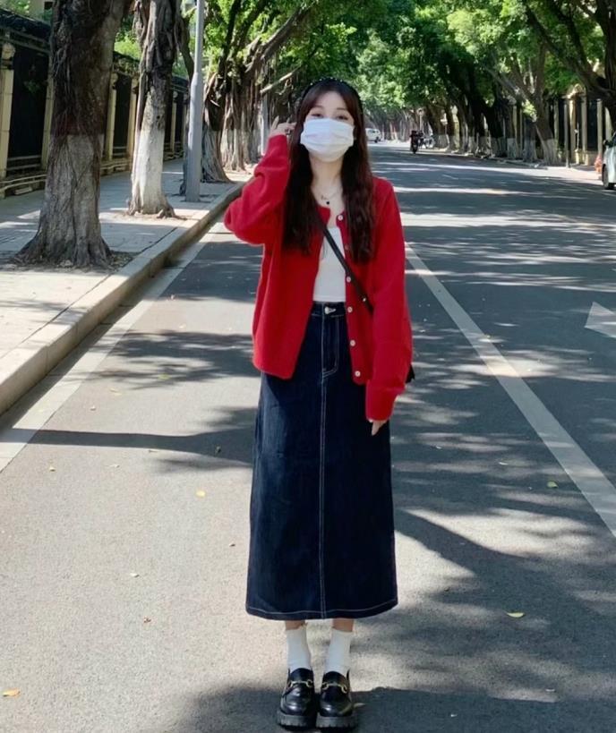 搭配上,紅色開衫也很好搭,配褲裝,或像這個小姐姐,選條牛仔半裙,超棒。