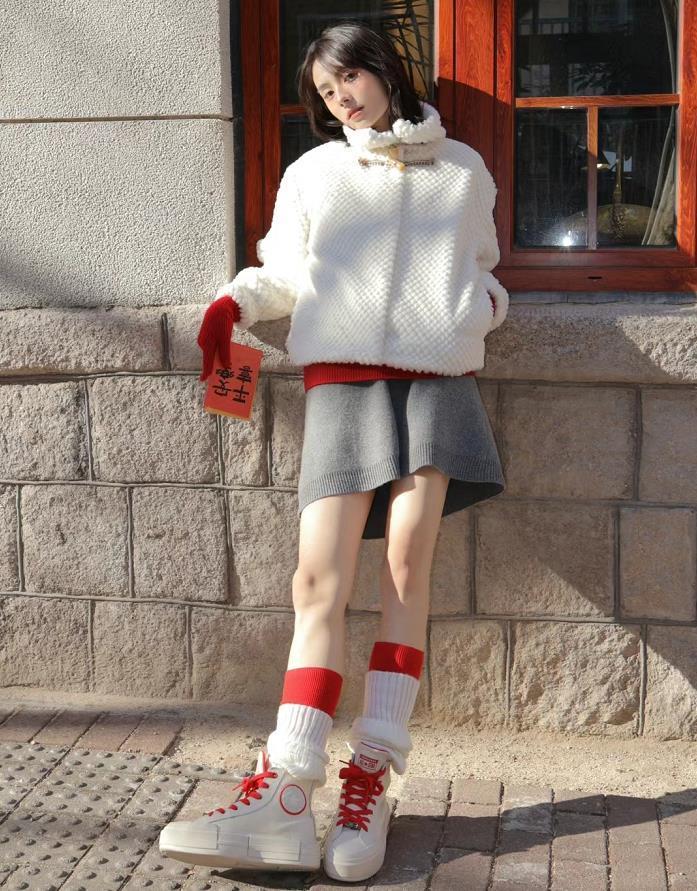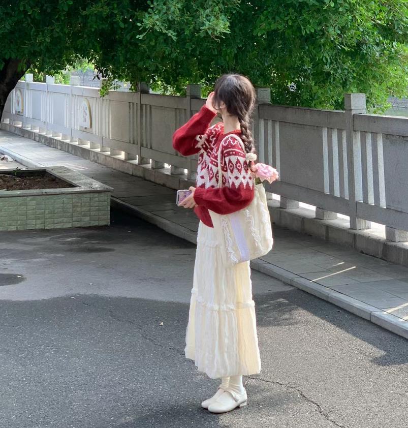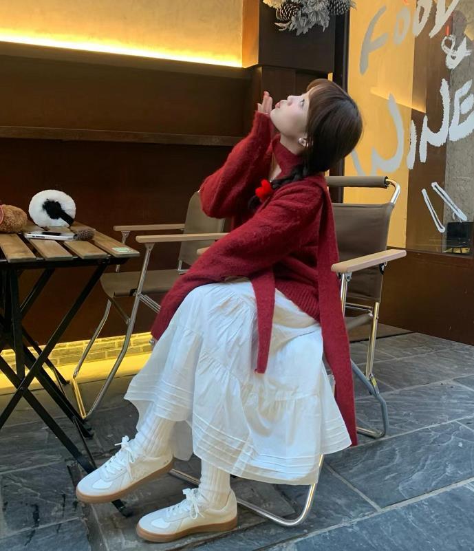 很適合過年的一套啊,頗有氛圍感的,帶點復古氣息的紅色毛衣,搭配仙氣感十足的白色半身長裙,鞋子也是白色的,好乖巧又溫柔。