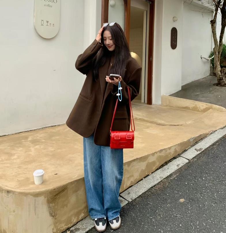 復古棕的西裝外套+牛仔褲,利用紅色包包點綴一下整個穿搭就很吸睛了,這樣的穿搭過年也是很不錯的啦。