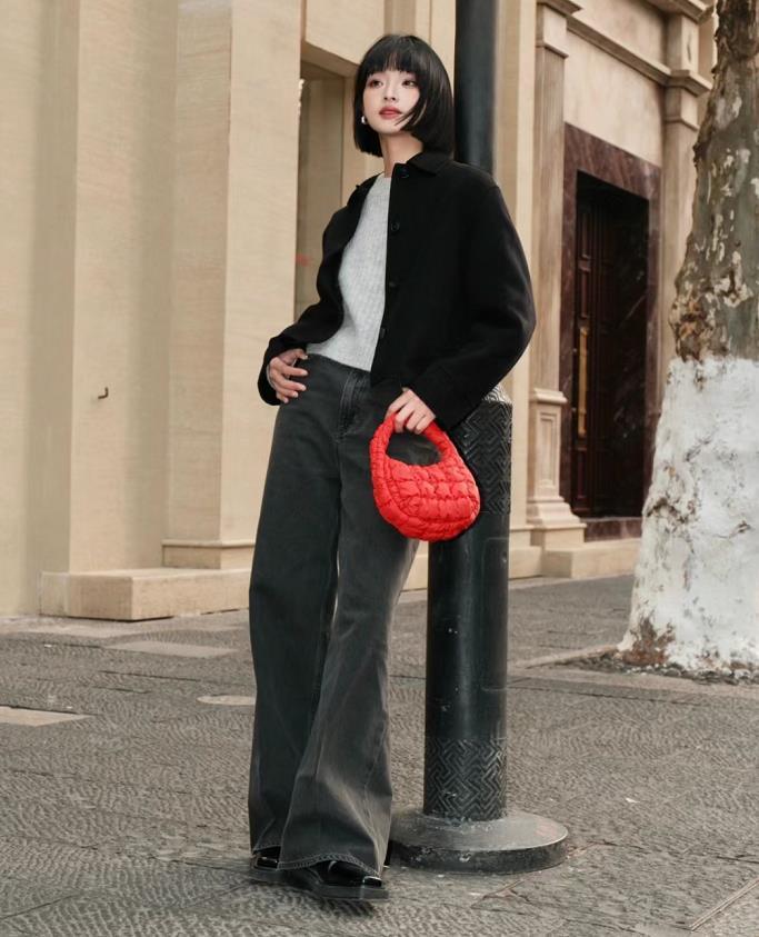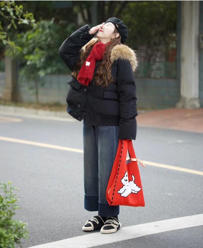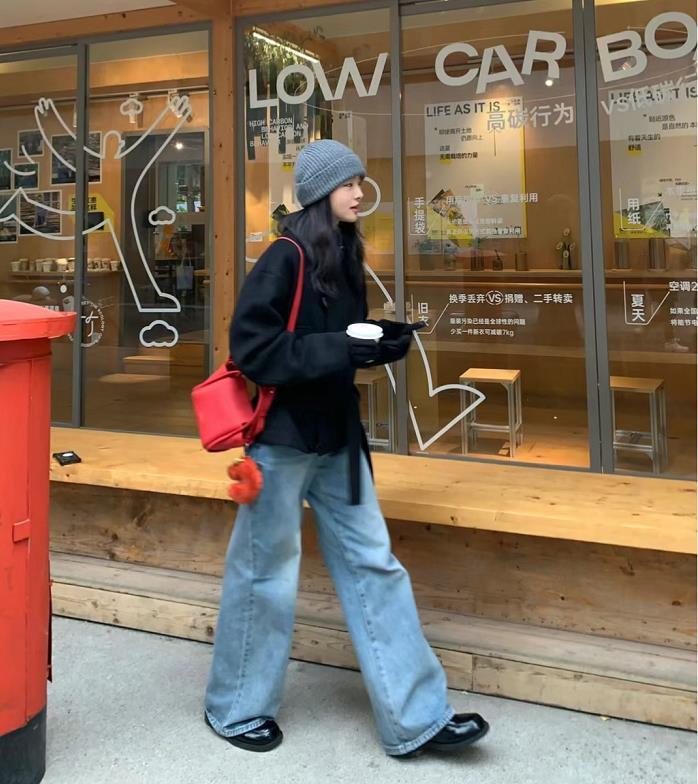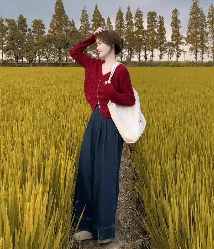 上短下長的組合,輕鬆優化整個身材比例,顯高挑又能打造出大長腿,短款紅色針織上衣+牛仔闊腿褲,這一身看起來就和顯瘦。