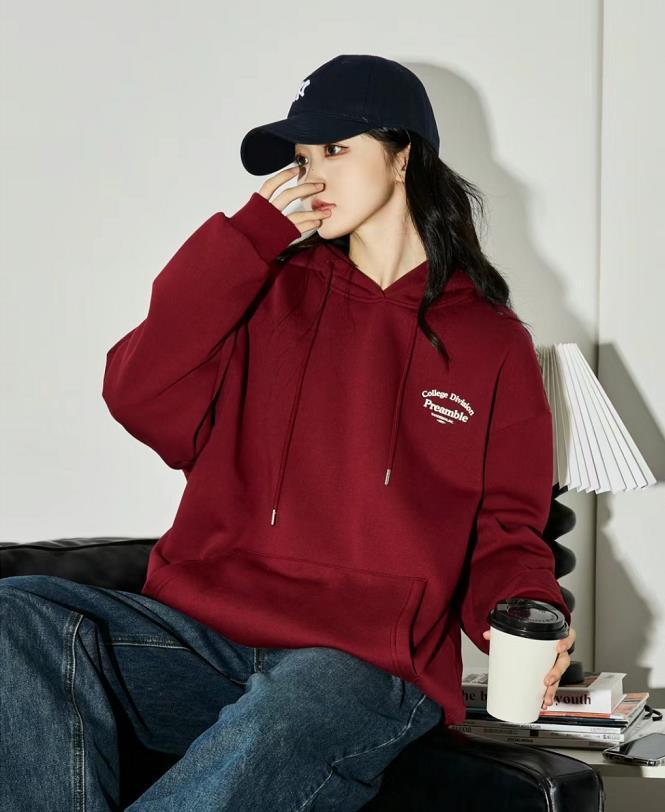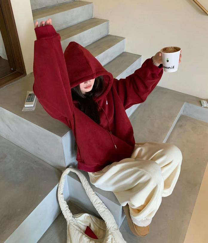 美式復古紅的連帽衛衣,溫暖又熱烈,低調簡約的酒紅色,上身超顯白的,大大的版型,包裹感很強,顯瘦更舒適。