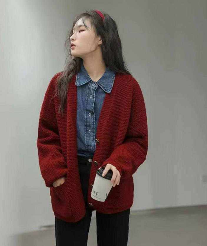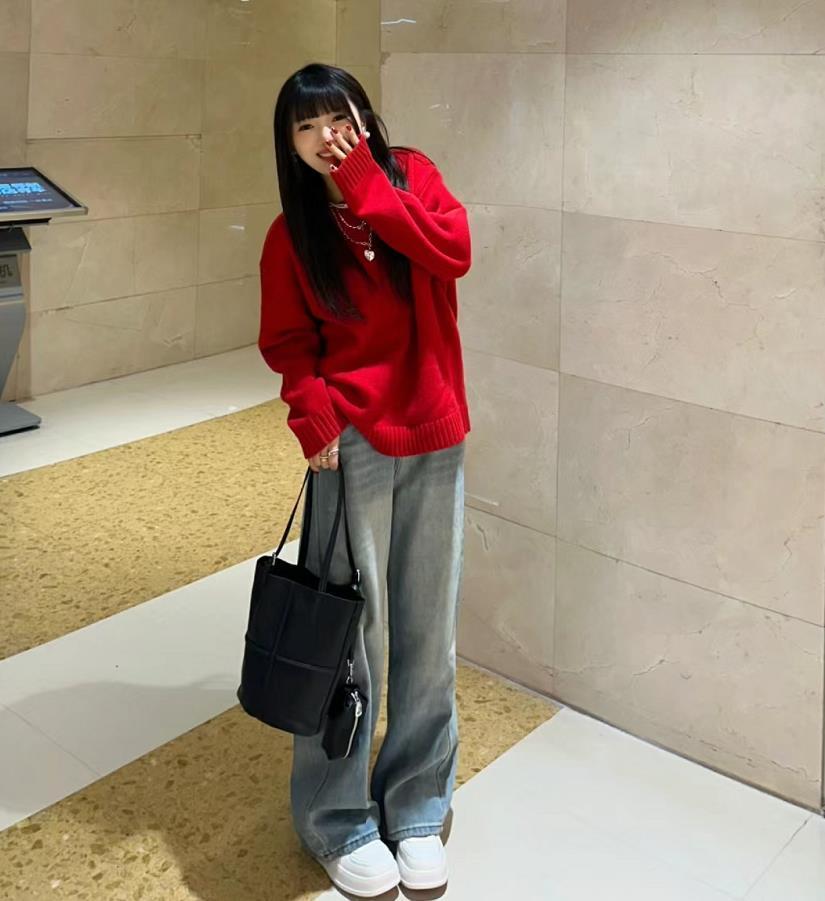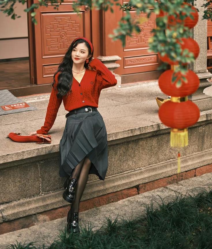 過年穿這身低調又很有節日氛圍感,復古的紅色毛衣開衫,上身就有種慵懶的調調,內搭牛仔襯衫,高級感滿滿。
