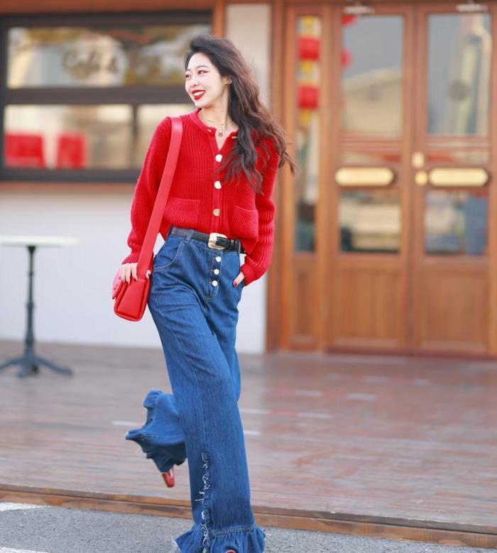 新年當然要氛圍紅啊,紅藍撞色的組合,復古風滿滿,短款金色紐扣毛衣開衫配復古喇叭牛仔褲,顯腿長又顯高挑。