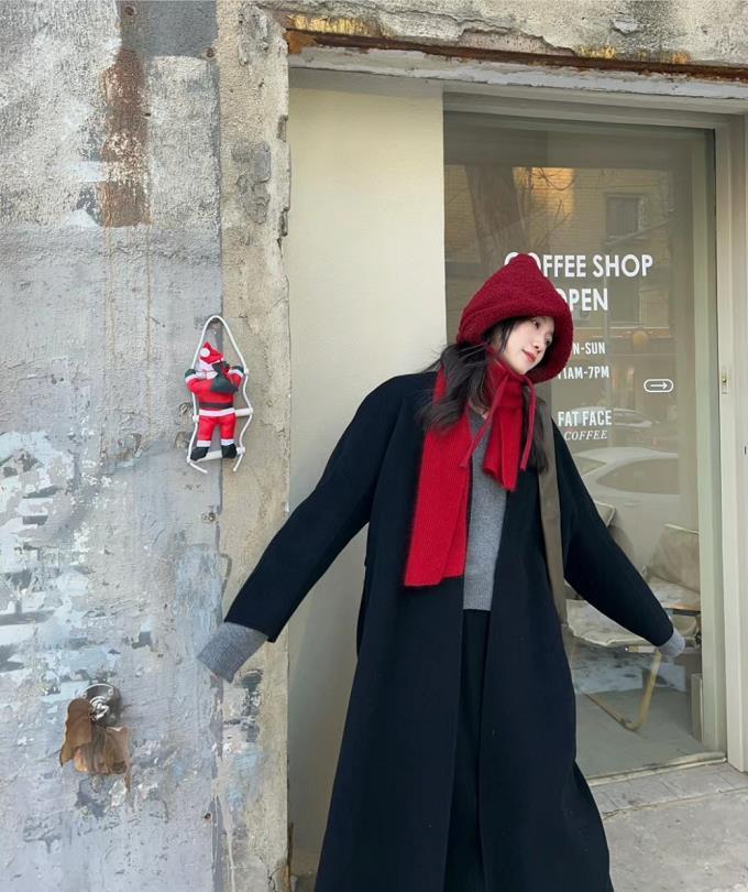 黑色的長款大衣,經典大方又顯瘦,這個顏色雖然看起來沉悶,但經過紅色圍巾和帽子進行點綴,就瞬間提升了造型的洋氣與吸睛。
