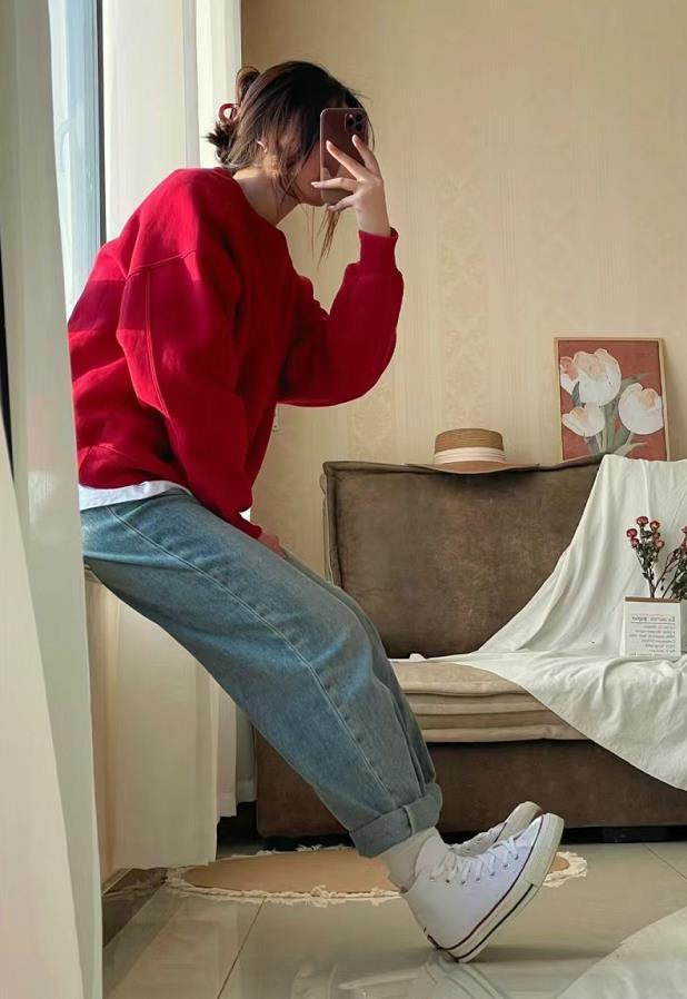 沒有一件紅色的單品怎能過新年呢?喜歡這件不張揚的紅色衛衣,可以單穿,也可以在裏面疊穿一件白色t恤,稍微露出一點下襬來,就可以打造出層次。