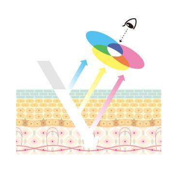 藍色、黃色和紅色光以平衡方式反射,肌膚透明感顯著增強