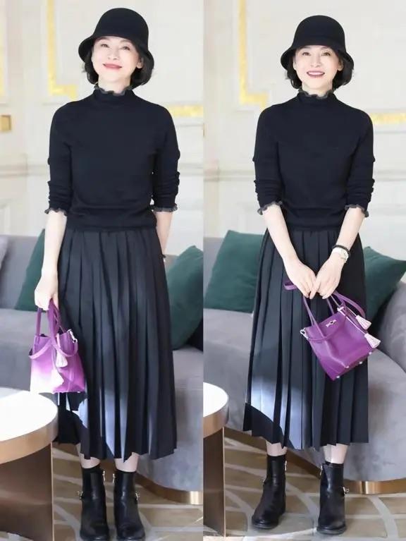 40+的年紀,我們可以嘗試溫柔知性的穿搭,這是一種更加大方體面的表現方式。比如基礎修身的打底衫,配一條簡約的百褶半身裙,就更加溫柔大方。