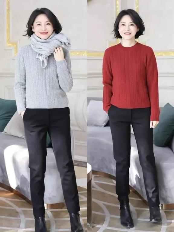 40+的年紀,穿衣搭配上也更加註重保暖性。這時候高領的毛衣,就是更加保暖的選擇。我們穿一件高領毛衣,可以配寬鬆的外套,舒適又大方。