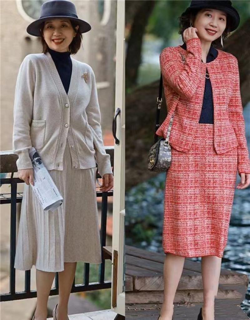 對於50+的女人來講,如果身材氣質不夠優越的話,就不要盲目的選擇外套。粗花呢的小香風外套,千鳥格的圖案,也很容易穿出土氣感。