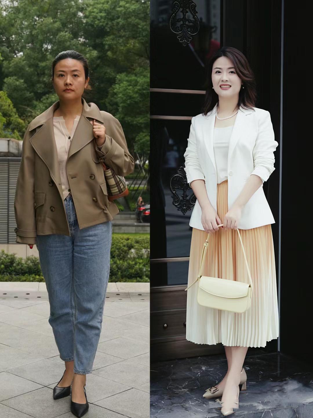 這種毫無設計感的外套,就特別容易暴露我們的年紀,尤其是深色系的搭配非常顯老氣。我們可以嘗試選擇亮色系的西服外套,簡單大方又顯氣質。