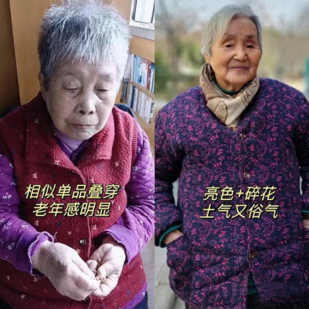 這種奶奶棉襖,真的是要避開呀。即便是到了50+的年紀,也沒有必要着急扮老。遠離這種浮誇的亮色+碎花元素的棉襖,一看就透着年代感、特別顯老氣。