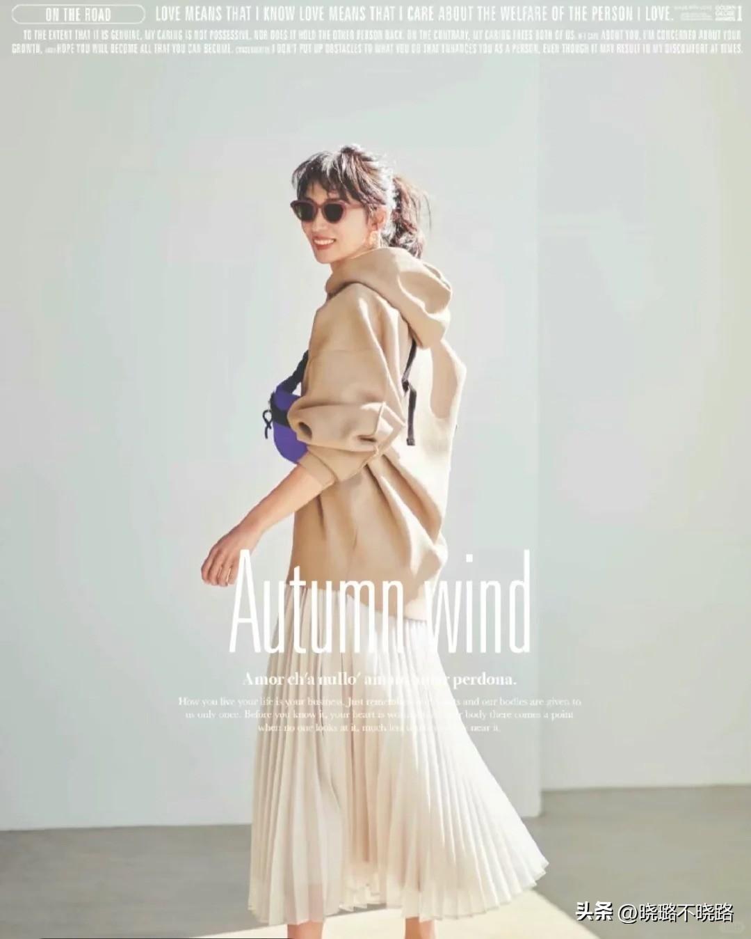 即使是秋冬季節的穿搭,但造型裏依舊需要注意營造出輕盈感覺。所以我們可以像日本雜誌中那樣,挑選一件比較寬鬆厚實的衛衣,搭配材質稍微輕薄一些,且裙面帶有一些層次感的的半裙。