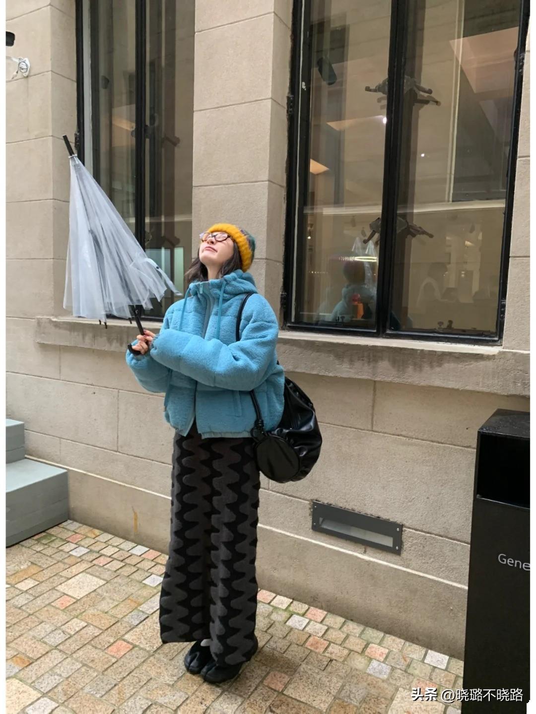 像這種造型裏的重點就是下半部分的黑色裏,所以挑選一條高腰闊腿褲,不僅在遮肉方面產生了很不錯的效果,而且還幫助塑造了高挑顯瘦的作用。