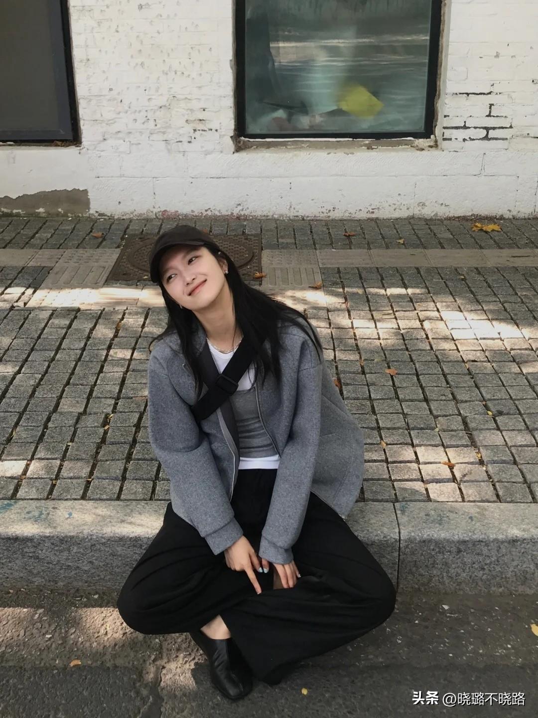 上半身的短款灰色外套,搭配白色的修身內搭,將內外層次凸顯出來,形成上淺下深的效果。