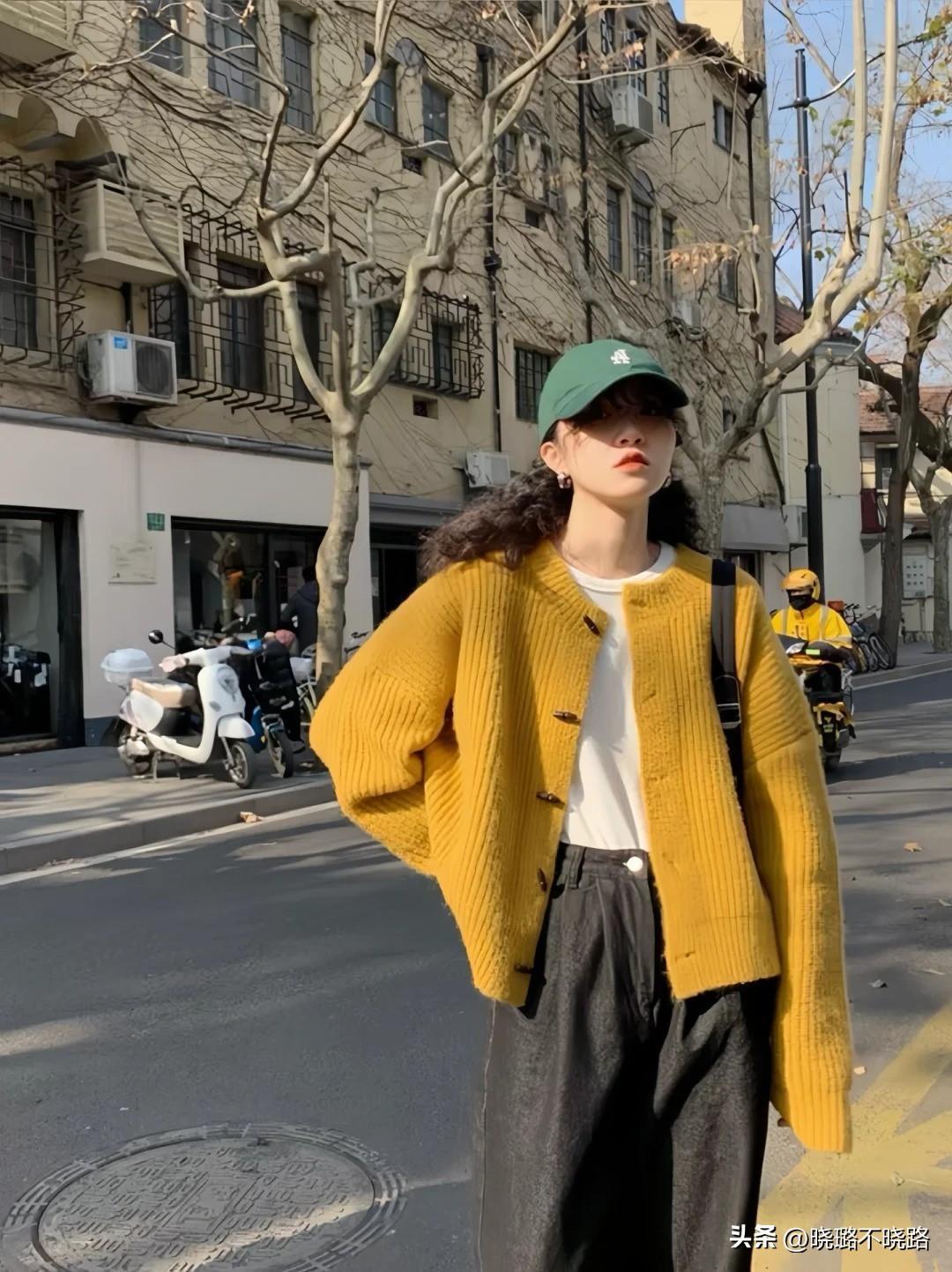 如果想要迎合秋冬系列的氛圍,那麼咱可以加點米黃色的針織開衫作爲上衣系列,裏面加上白色的基礎款長袖,這樣內外有色調之間的反差,同時也產生了視覺上的留白效果。