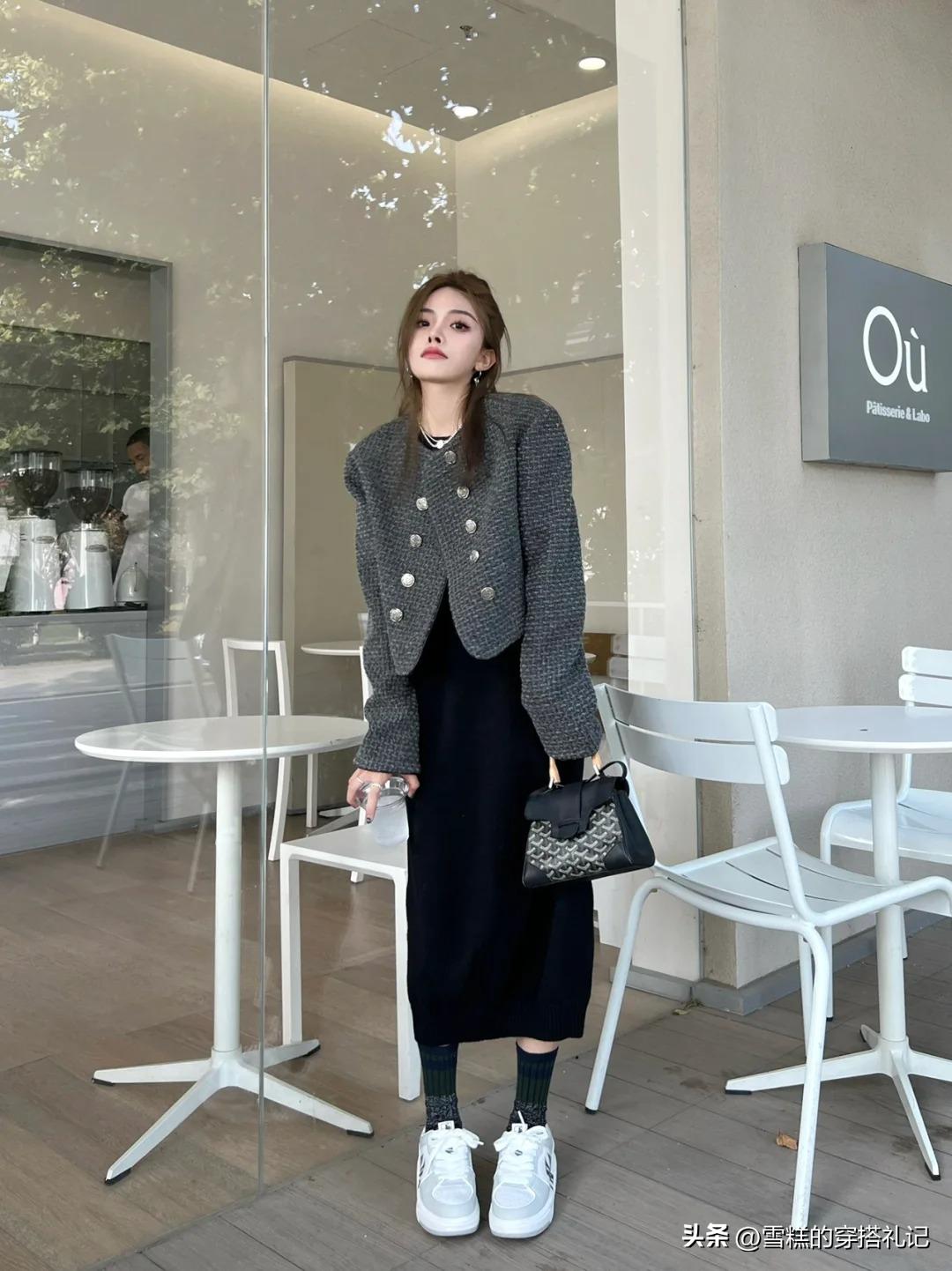 這種自帶復古味道的單品不光款式時尚,在穿搭的世界裏也有屬於自己的舒適圈。像近段時間潮人圈裏很流行的小香風外套+長裙組合,短而高級的外套配合簡約遮肉的長裙,長短對比,繁簡交替裏自然就能釋放出高級和時尚的氣質。