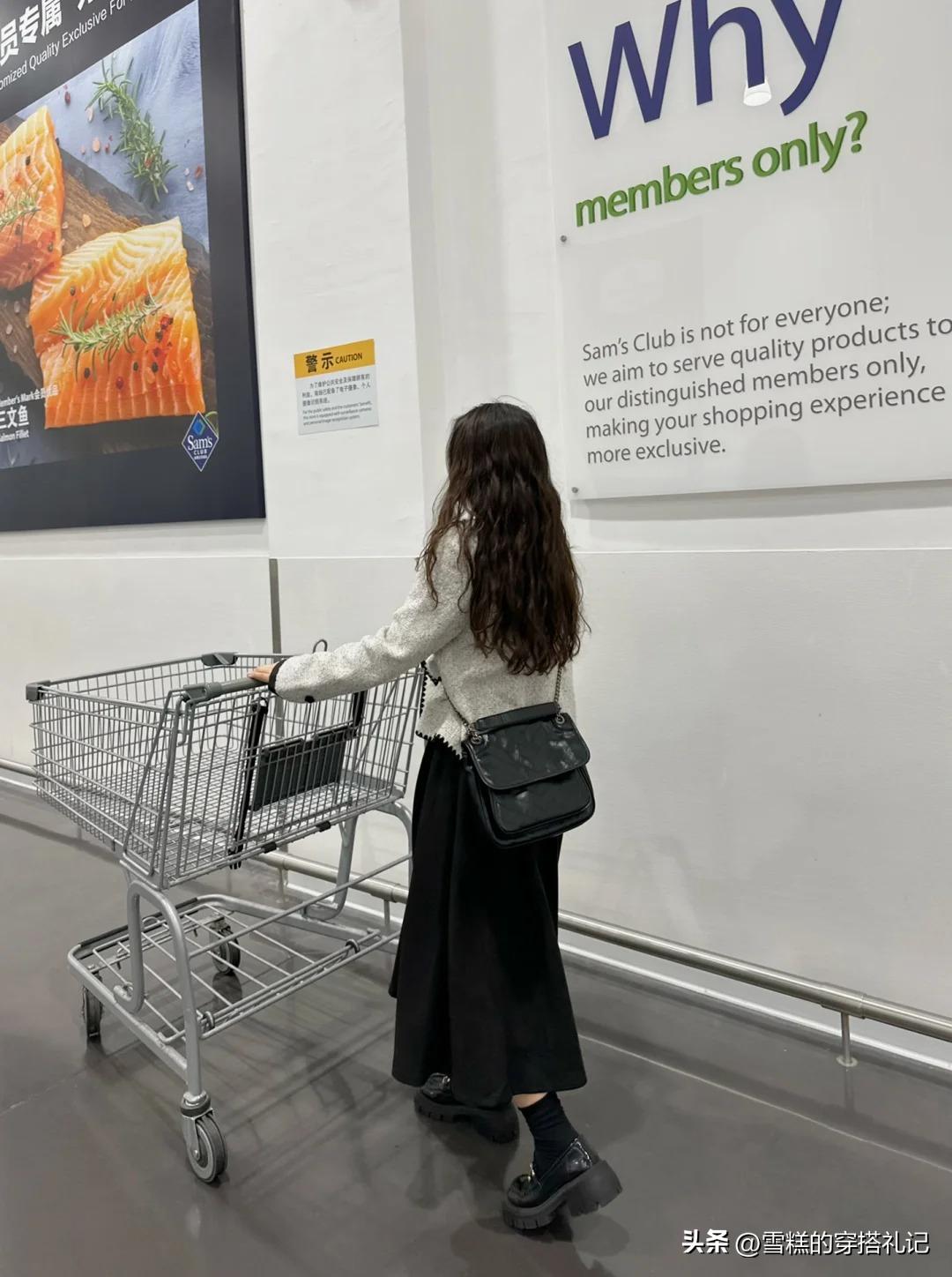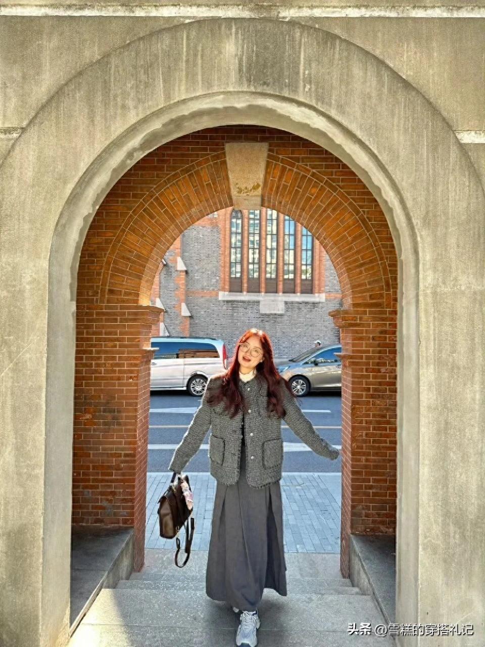 下半身配上一條寬鬆,遮肉的灰色直筒長裙,三種顏色互相融合,上下過渡自然又有序。