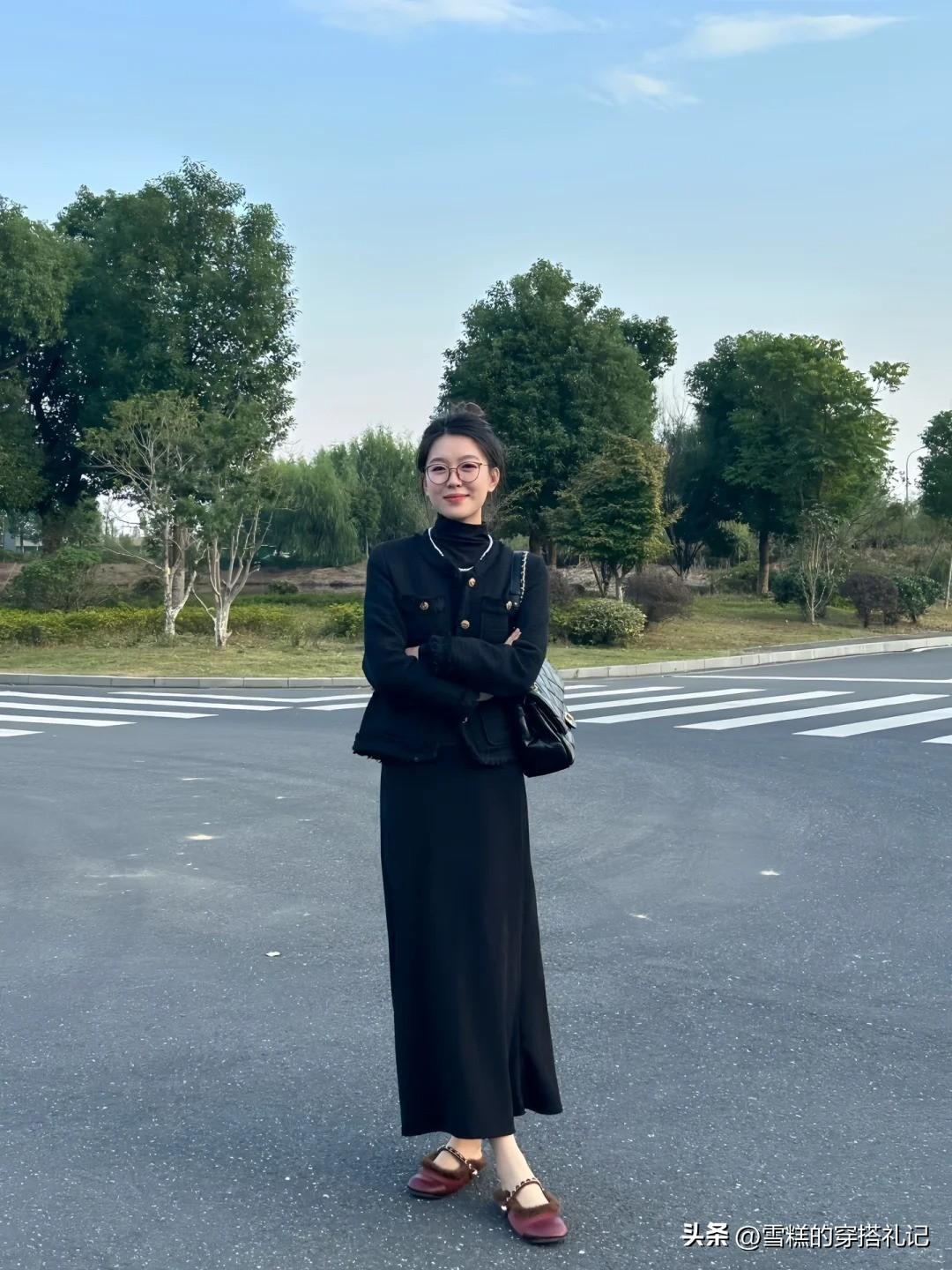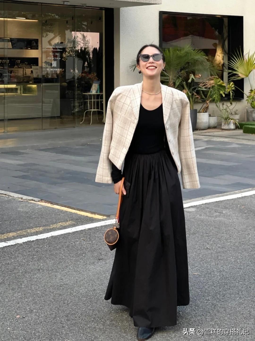 長裙之所以如此受歡迎,很大程度上是因爲它帶有明顯的顯瘦和優化比例作用。在搭配小香風系列過程裏,我們不如利用深色系裙裝延續這種感覺,進而搭配一些衣身偏短,淺色打底的上衣,進一步縮短上半身在造型裏的比例,進一步增加下半身的長度,以此來製造出高挑,有質感的造型效果。