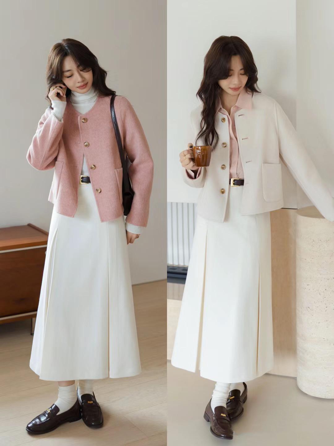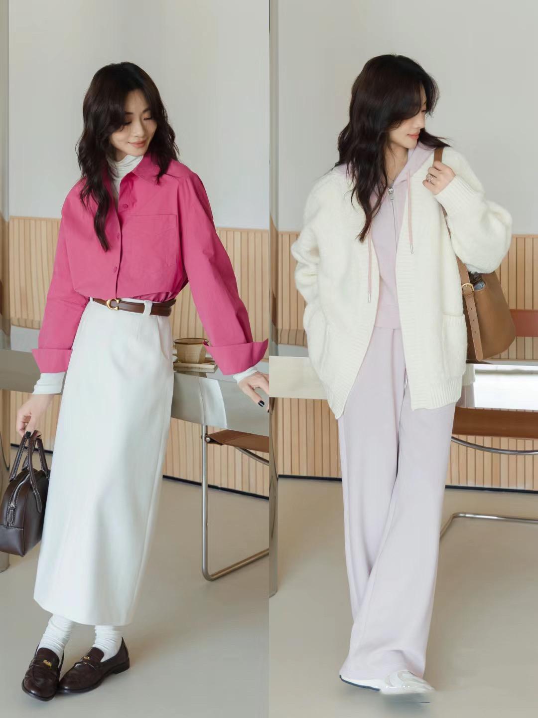 粉色毛呢外套、高腰的白色半身裙、以及色彩柔和的打底衫,組合在一起有一種溫柔嫺靜的美。尤其是這種修身的白色打底衫,可以配軟糯的面料,顯瘦的同時還很貴氣。