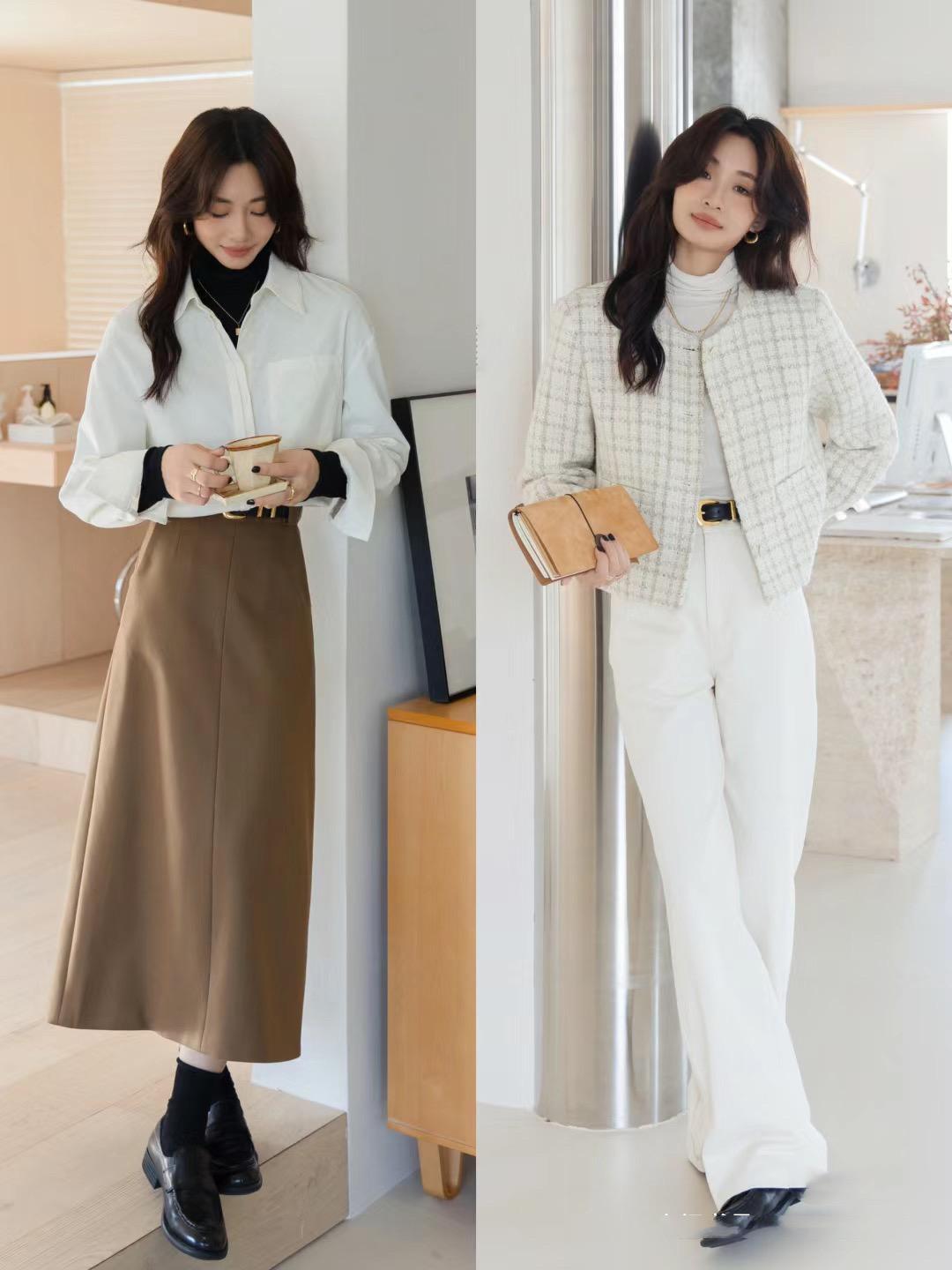 選擇半高領打底衫,可以配比較細膩軟糯的材質,帶着溫柔的觸感、保暖性更強。我們可以搭配高腰的直筒褲、或者A字形半身裙,塑造出更優越的上下比例。