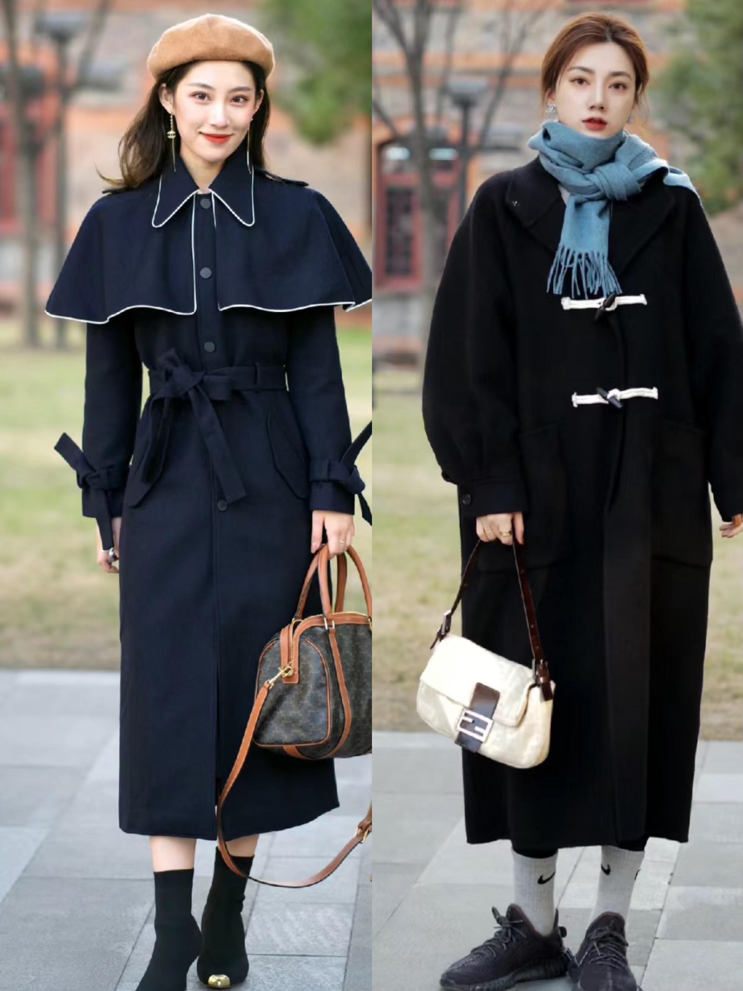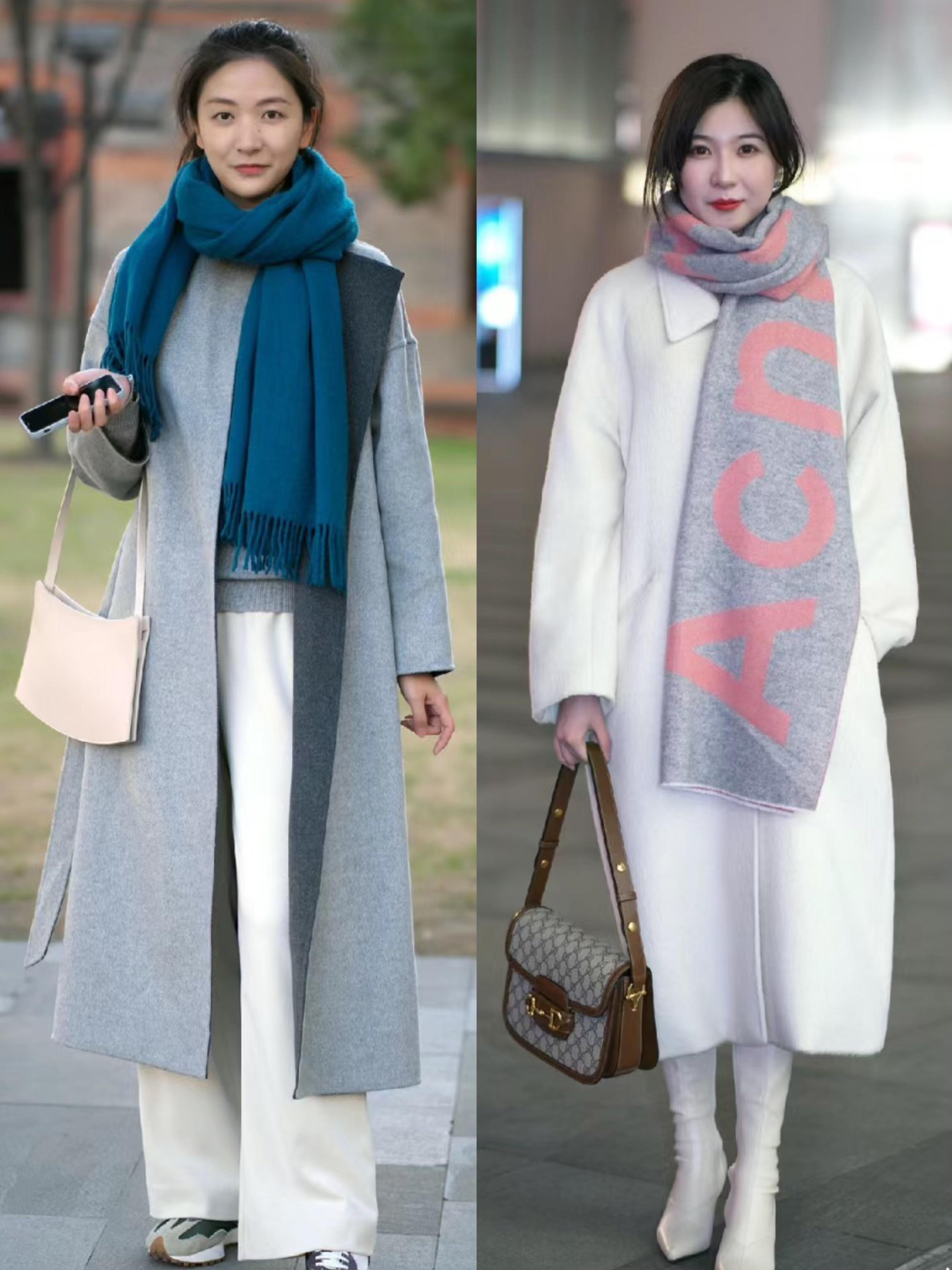 我們穿純色系的毛呢大衣,可以搭配稍微厚重一點的羊絨大衣。羊絨圍巾可以配比較軟糯的面料,寬大的版型,既保暖又溫柔耐看。