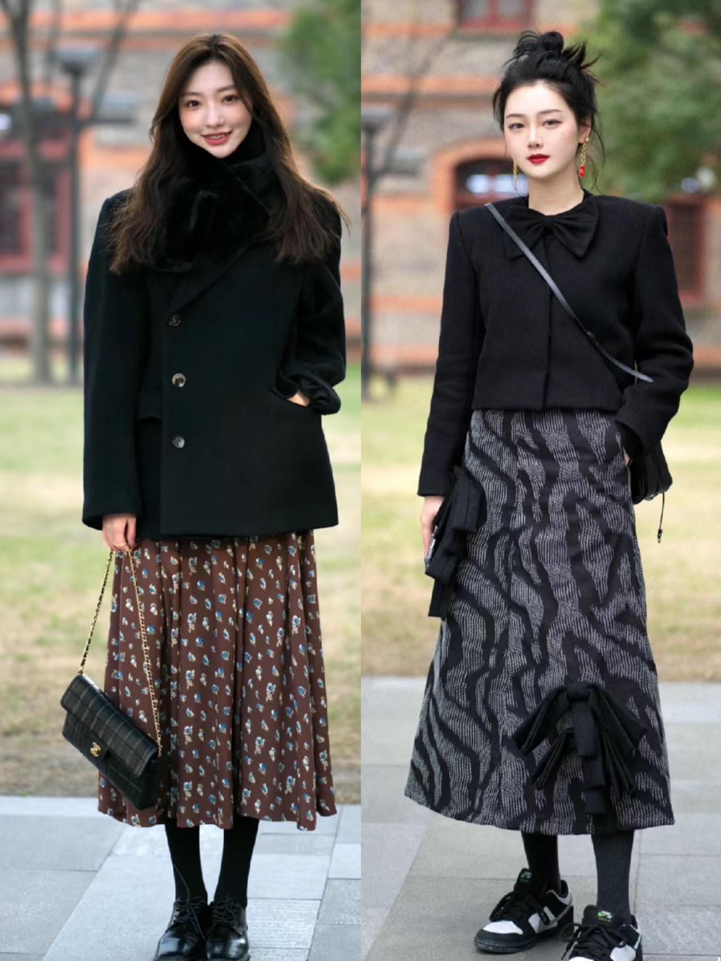 像這種短款的黑色大衣,自然是與高腰的半身裙更配呀。裙裝的浪漫、與黑色大衣的精緻,塑造出更加溫柔高級的美。高腰的A字形黑色半身裙,也很大氣耐看。