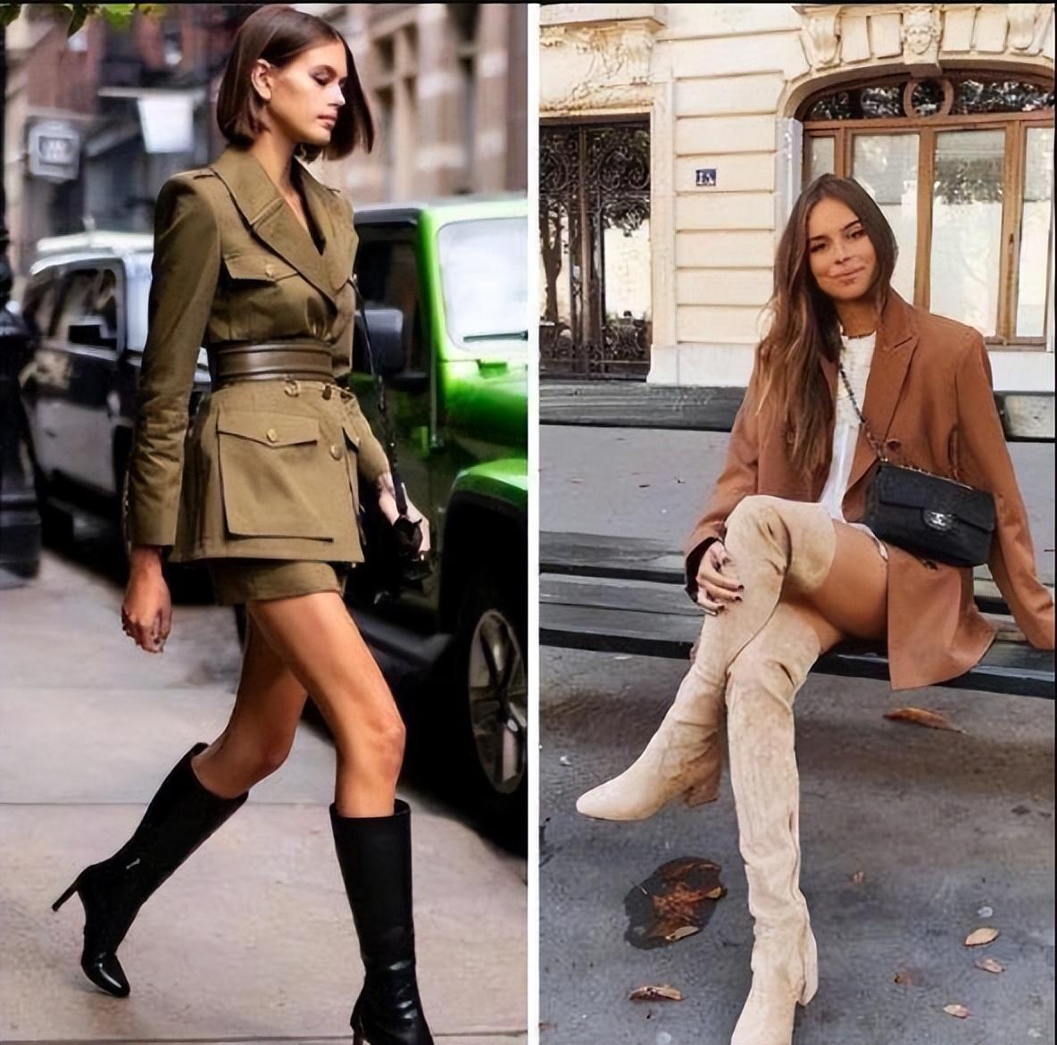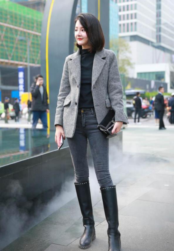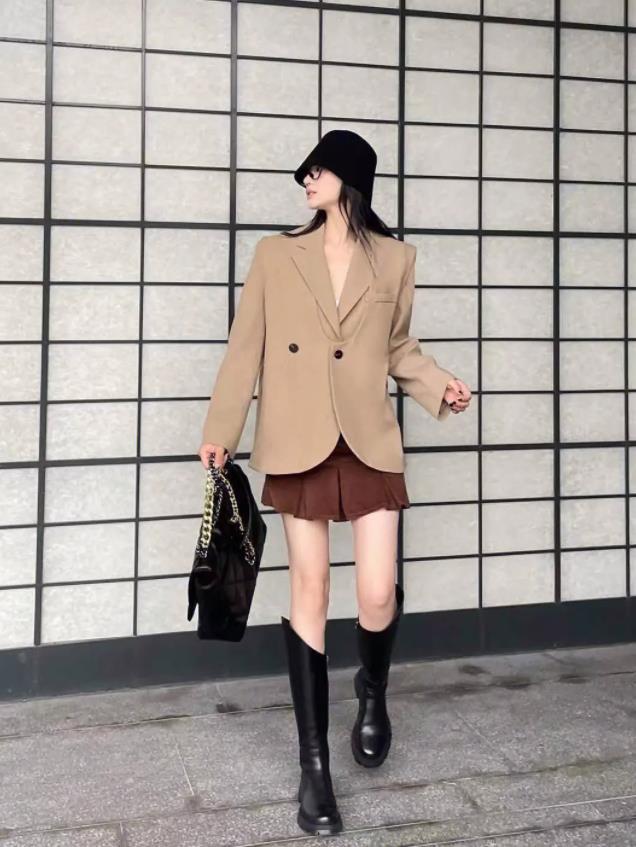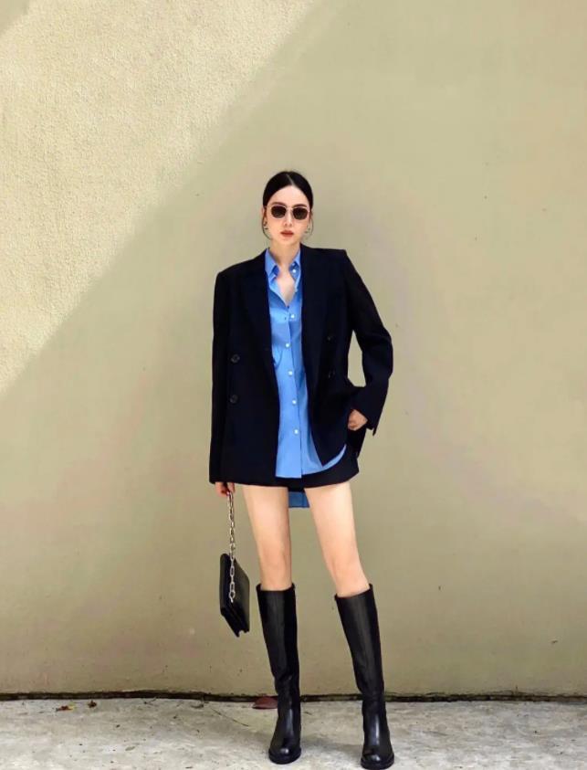 在職場的姐妹們,還可以選擇西裝外套來配長靴,這種穿搭整體就顯得比較幹練利落,下身可以搭配牛仔褲,短裙等。