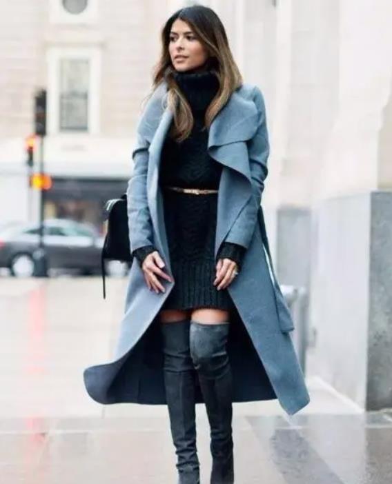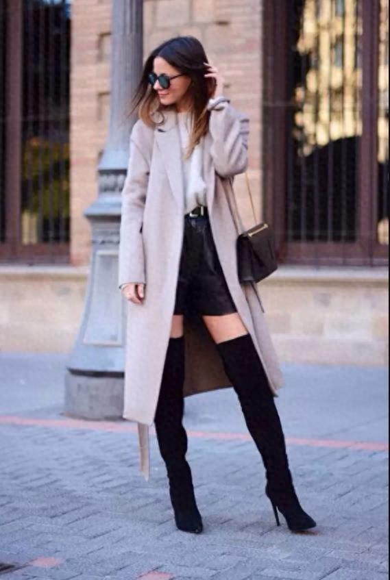 不過要是小個子女生的話,選長款大衣來穿,還配長靴,那麼下裝就進來選擇短裙來配,適當露出一些腿部肌膚,或者提高起腰線比例來,都能大程度拉長整個身材比例。