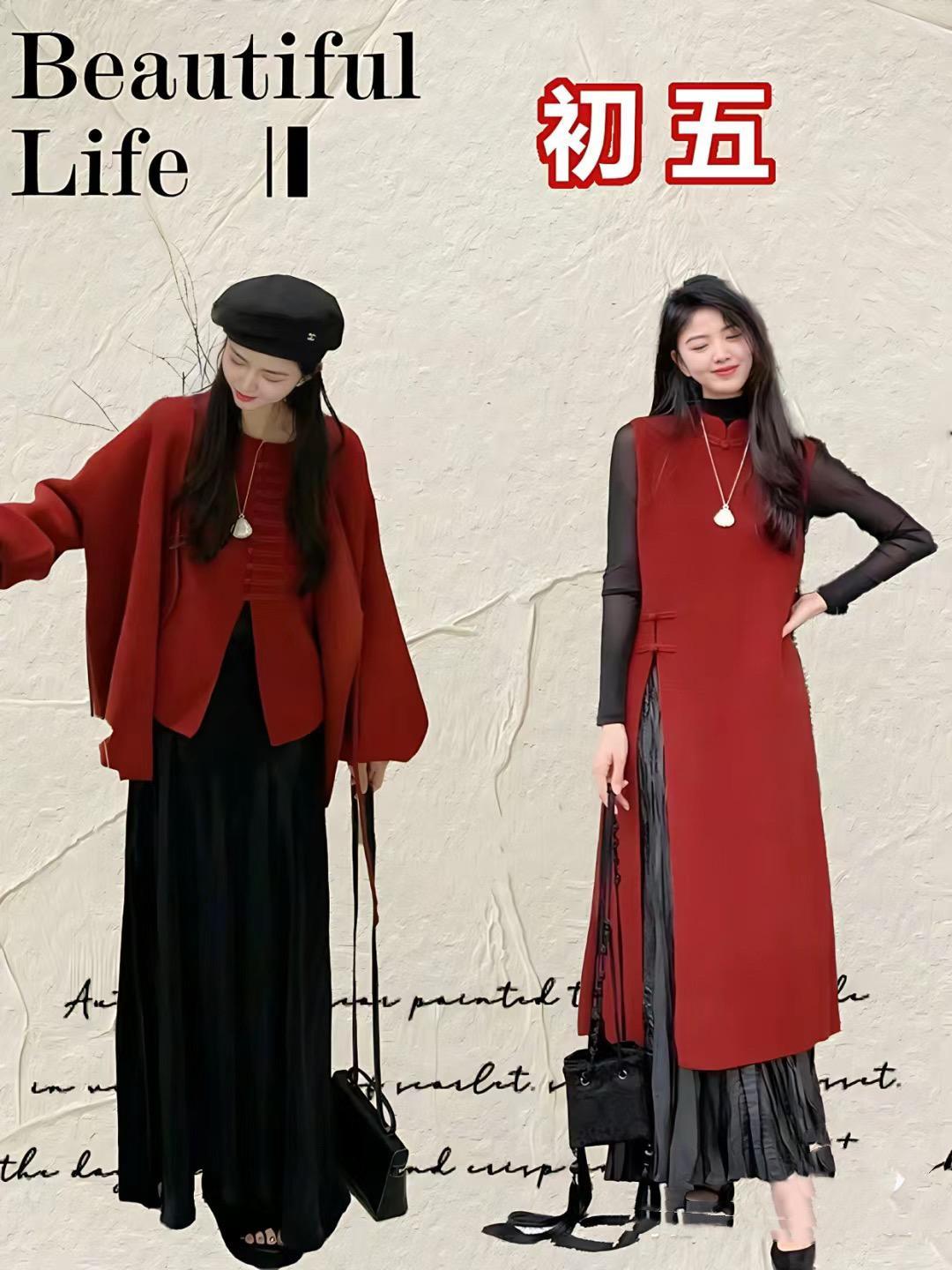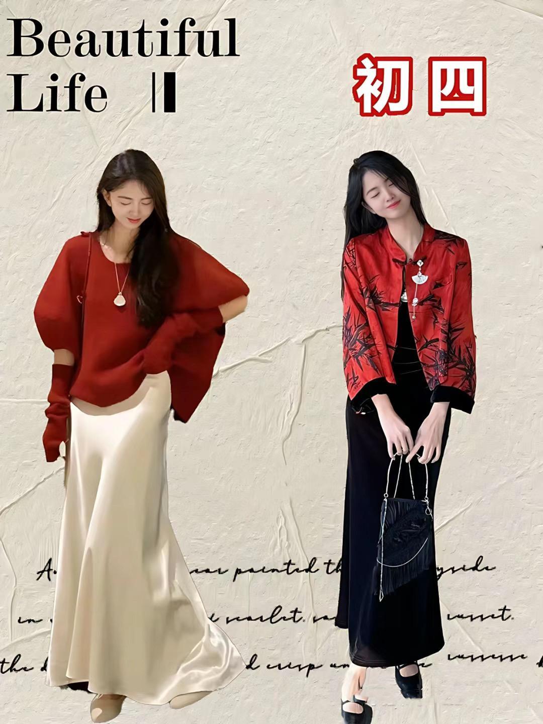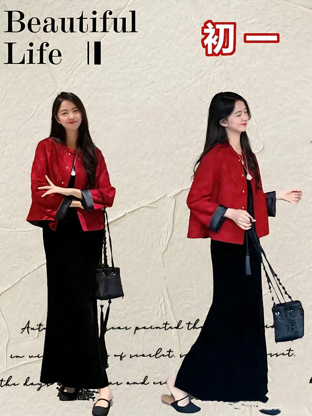 紅色毛衣配白色緞面過膝裙,就是舒適慵懶、且溫婉甜美的。而國風短外套配黑色及踝半身裙,就更加雅緻耐看,也更具備了新年氛圍,都比較適合新年穿着。