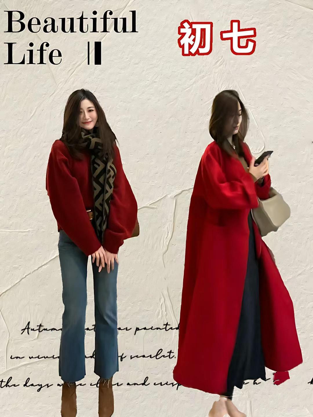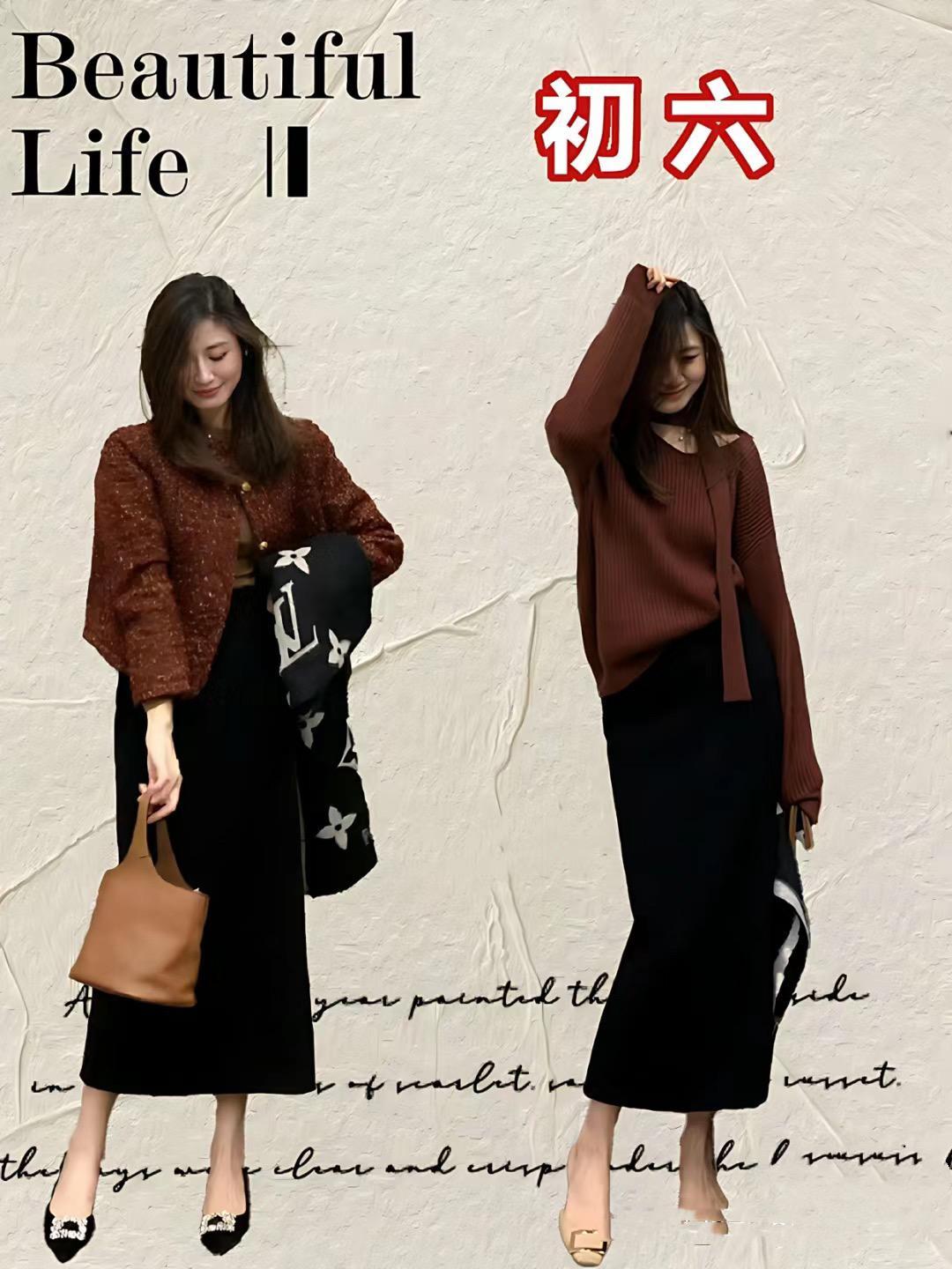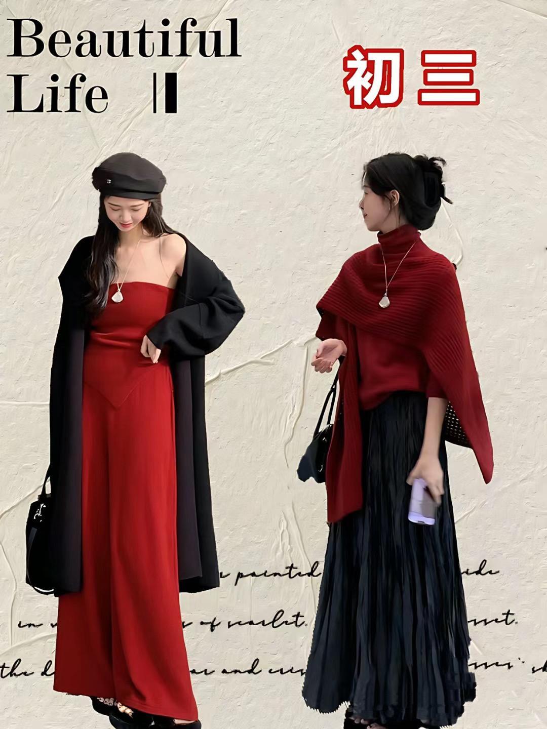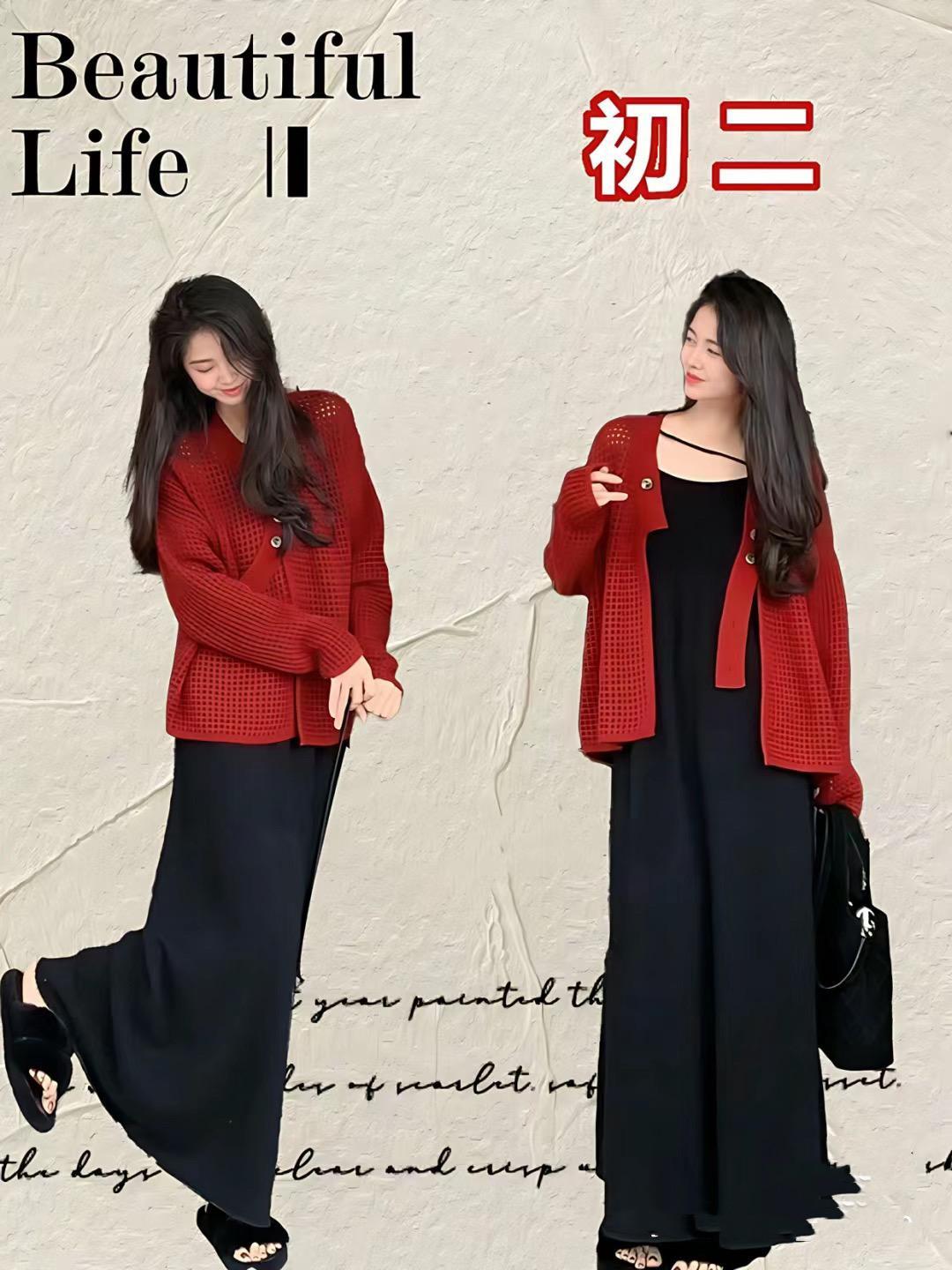 紅色毛衣配白色緞面過膝裙,就是舒適慵懶、且溫婉甜美的。而國風短外套配黑色及踝半身裙,就更加雅緻耐看,也更具備了新年氛圍,都比較適合新年穿着。