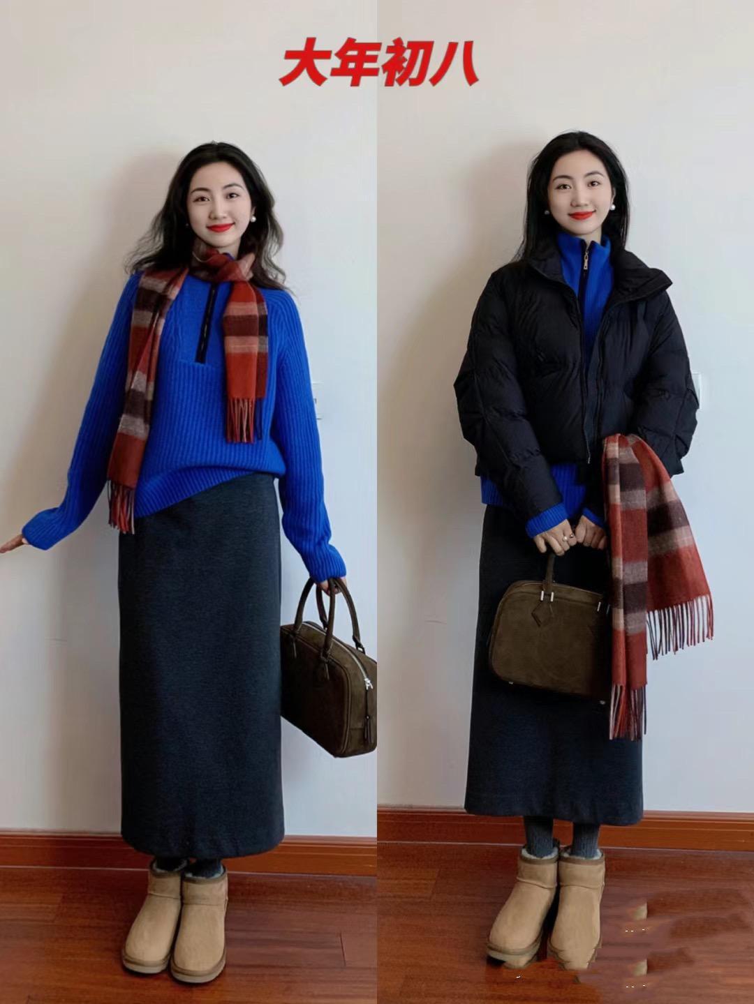像這種克萊因藍的毛衣,配上高腰的直筒半身裙,簡簡單單就很體面。日常的搭配中,高腰的直筒半身裙舒適自在,挺闊的面料也會顯得很高級。大年初八穿直筒半身裙,依然展現着女性的溫柔體面。